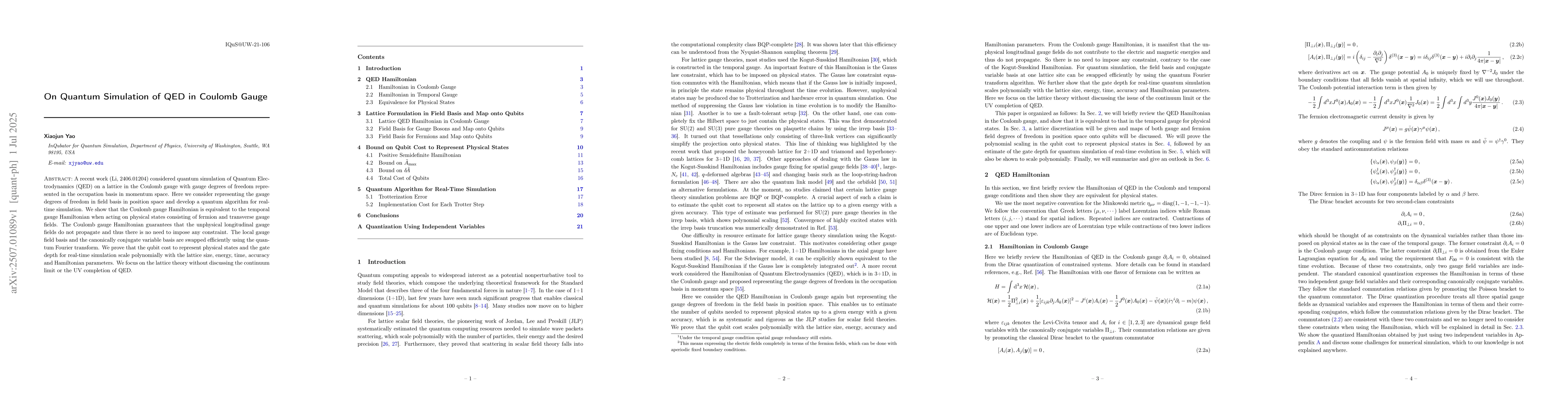 A recent work (Li, 2406.01204) considered quantum simulation of Quantum Electrodynamics (QED) on a lattice in the Coulomb gauge with gauge degrees of freedom represented in the occupation basis in momentum space. Here we consider representing the gauge degrees of freedom in field basis in position space and develop a quantum algorithm for real-time simulation. We show that the Coulomb gauge Hamiltonian is equivalent to the temporal gauge Hamiltonian when acting on physical states consisting of fermion and transverse gauge fields. The Coulomb gauge Hamiltonian guarantees that the unphysical longitudinal gauge fields do not propagate and thus there is no need to impose any constraint. The local gauge field basis and the canonically conjugate variable basis are swapped efficiently using the quantum Fourier transform. We prove that the qubit cost to represent physical states and the gate depth for real-time simulation scale polynomially with the lattice size, energy, time, accuracy and Hamiltonian parameters. We focus on the lattice theory without discussing the continuum limit or the UV completion of QED.