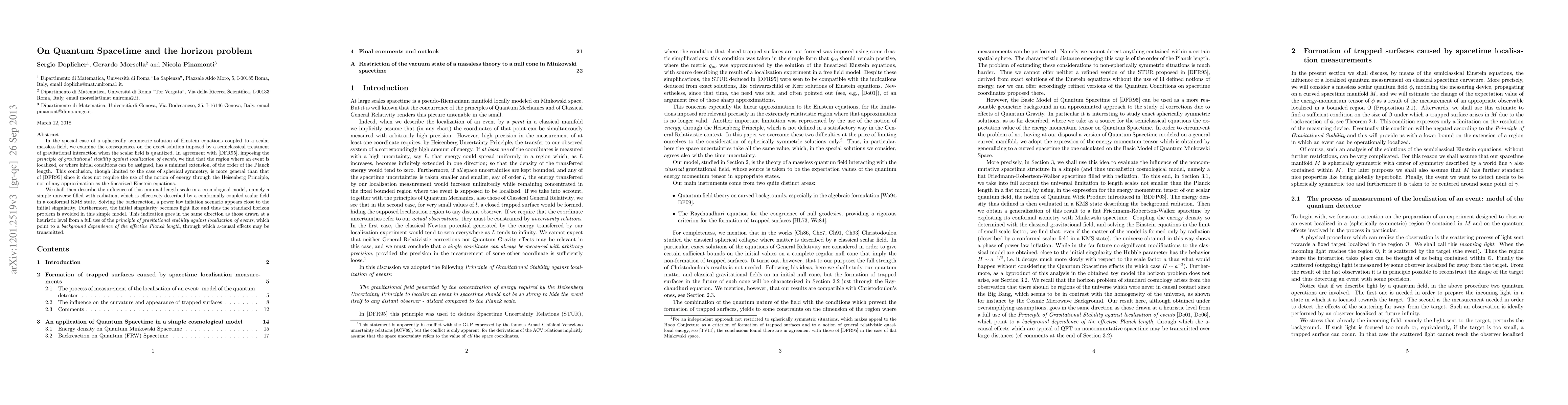 In the special case of a spherically symmetric solution of Einstein equations coupled to a scalar massless field, we examine the consequences on the exact solution imposed by a semiclassical treatment of gravitational interaction when the scalar field is quantized. In agreement with the work of Doplicher, Fredenhagen and Roberts (DFR), imposing the principle of gravitational stability against localization of events, we find that the region where an event is localized, or where initial conditions can be assigned, has a minimal extension, of the order of the Planck length. This conclusion, though limited to the case of spherical symmetry, is more general than that of DFR, since it does not require the use of the notion of energy through the Heisenberg Principle, nor of any approximation as the linearized Einstein equations. We shall then describe the influence of this minimal length scale in a cosmological model, namely a simple universe filled with radiation, which is effectively described by a conformally coupled scalar field in a conformal KMS state. Solving the backreaction, a power law inflation scenario appears close to the initial singularity. Furthermore, the initial singularity becomes light like and thus the standard horizon problem is avoided in this simple model. This indication goes in the same direction as those drawn at a heuristic level from a full use of the principle of gravitational stability against localization of events, which point to a background dependence of the effective Planck length, through which a-causal effects may be transmitted.