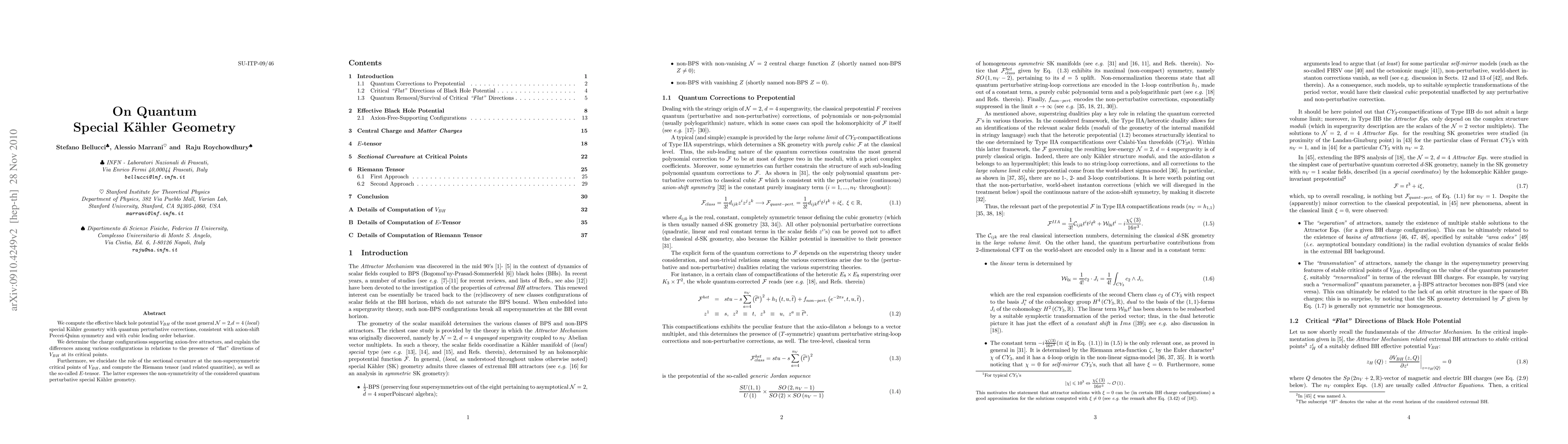 We compute the effective black hole potential V of the most general N=2, d=4 (local) special Kaehler geometry with quantum perturbative corrections, consistent with axion-shift Peccei-Quinn symmetry and with cubic leading order behavior. We determine the charge configurations supporting axion-free attractors, and explain the differences among various configurations in relations to the presence of ``flat'' directions of V at its critical points. Furthermore, we elucidate the role of the sectional curvature at the non-supersymmetric critical points of V, and compute the Riemann tensor (and related quantities), as well as the so-called E-tensor. The latter expresses the non-symmetricity of the considered quantum perturbative special Kaehler geometry.