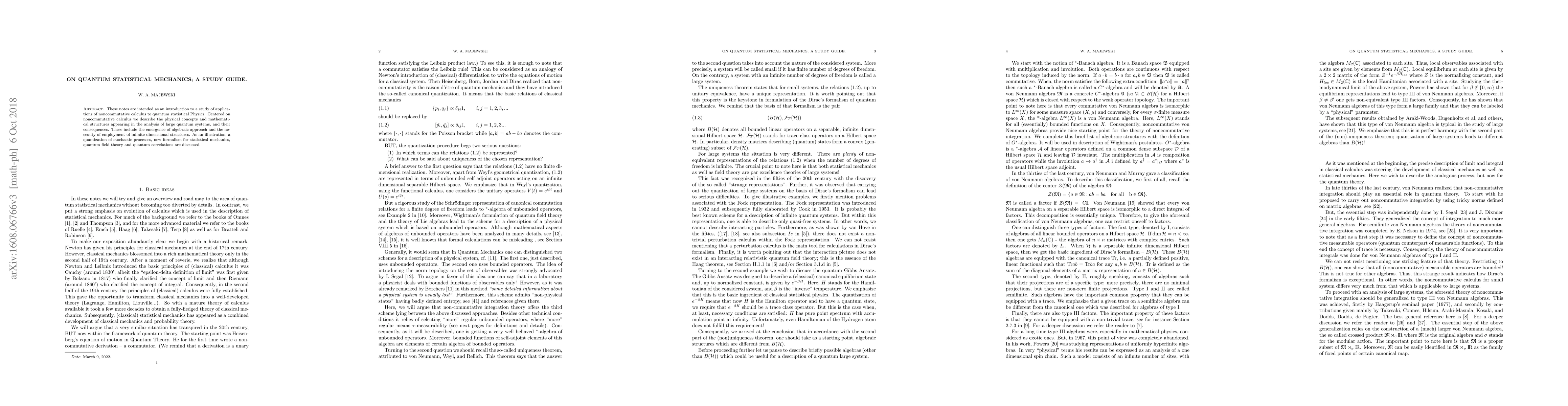This study guide introduces noncommutative calculus applications in quantum statistical physics, focusing on algebraic approaches and infinite-dimensional structures. It discusses quantization of stochastic processes, new statistical mechanics formalism, quantum field theory, and quantum correlations.