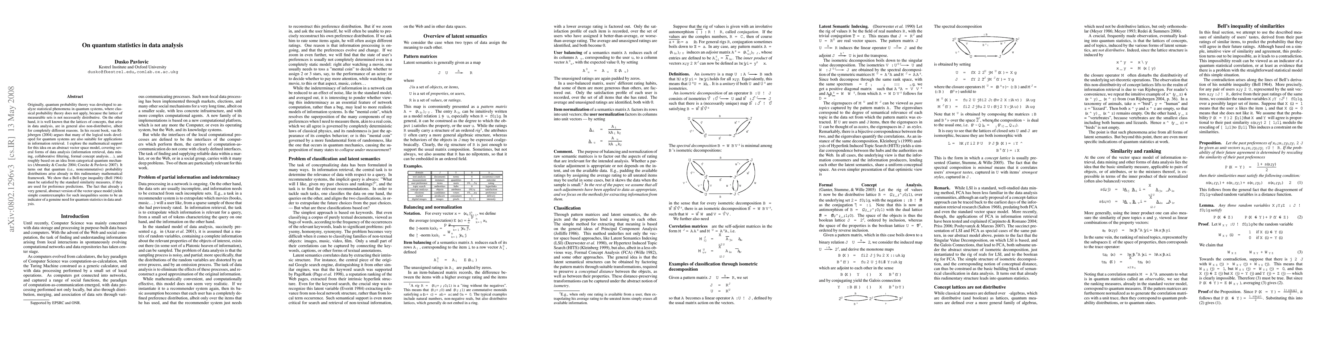 Originally, quantum probability theory was developed to analyze statistical phenomena in quantum systems, where classical probability theory does not apply, because the lattice of measurable sets is not necessarily distributive. On the other hand, it is well known that the lattices of concepts, that arise in data analysis, are in general also non-distributive, albeit for completely different reasons. In his recent book, van Rijsbergen argues that many of the logical tools developed for quantum systems are also suitable for applications in information retrieval. I explore the mathematical support for this idea on an abstract vector space model, covering several forms of data analysis (information retrieval, data mining, collaborative filtering, formal concept analysis...), and roughly based on an idea from categorical quantum mechanics. It turns out that quantum (i.e., noncommutative) probability distributions arise already in this rudimentary mathematical framework. We show that a Bell-type inequality must be satisfied by the standard similarity measures, if they are used for preference predictions. The fact that already a very general, abstract version of the vector space model yields simple counterexamples for such inequalities seems to be an indicator of a genuine need for quantum statistics in data analysis.