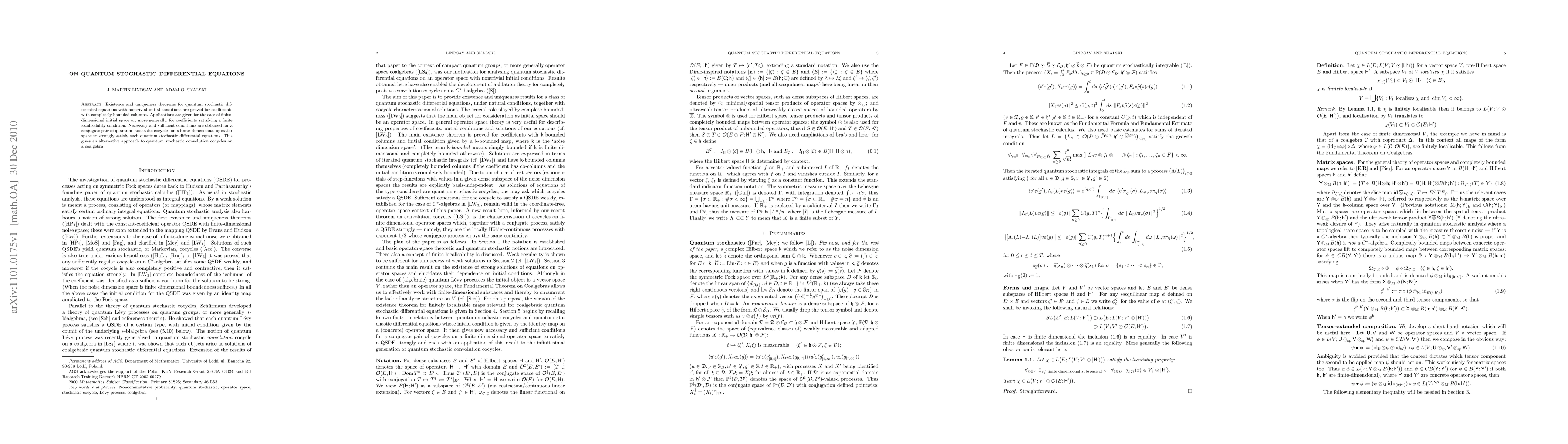 Existence and uniqueness theorems for quantum stochastic differential equations with nontrivial initial conditions are proved for coefficients with completely bounded columns. Applications are given for the case of finite-dimensional initial space or, more generally, for coefficients satisfying a finite localisability condition. Necessary and sufficient conditions are obtained for a conjugate pair of quantum stochastic cocycles on a finite-dimensional operator space to strongly satisfy such a quantum stochastic differential equation. This gives an alternative approach to quantum stochastic convolution cocycles on a coalgebra.
