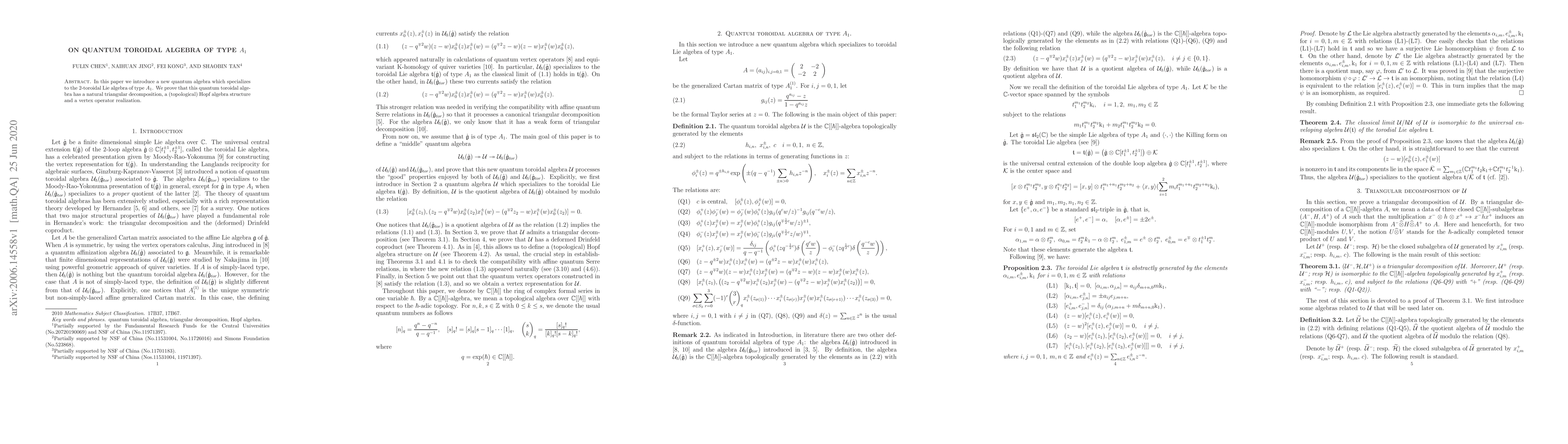 In this paper we introduce a new quantum algebra which specializes to the $2$-toroidal Lie algebra of type $A_1$. We prove that this quantum toroidal algebra has a natural triangular decomposition, a (topological) Hopf algebra structure and a vertex operator realization.