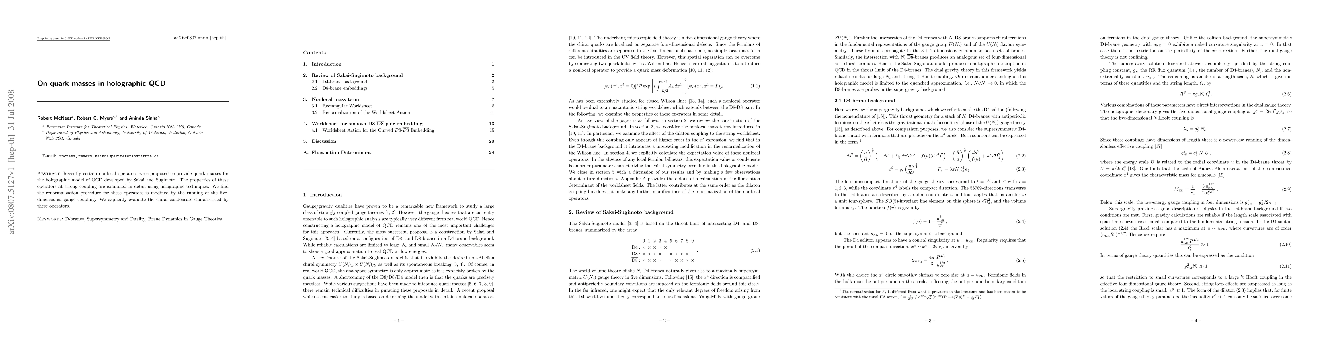 Recently certain nonlocal operators were proposed to provide quark masses for the holographic model of QCD developed by Sakai and Sugimoto. The properties of these operators at strong coupling are examined in detail using holographic techniques. We find the renormalization procedure for these operators is modified by the running of the five-dimensional gauge coupling. We explicitly evaluate the chiral condensate characterized by these operators.