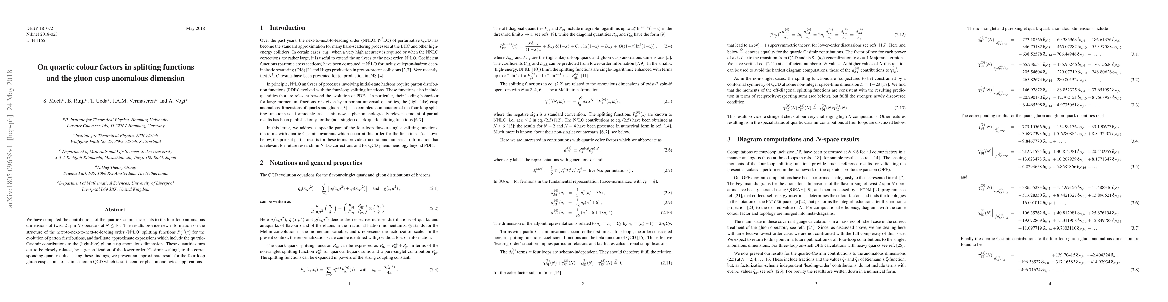 The paper calculates quartic Casimir invariants' contributions to four-loop anomalous dimensions of spin-N operators, revealing insights into N^3LO splitting functions and the gluon cusp anomalous dimension. These findings, connected via Casimir scaling to quark results, offer an approximate expression for the four-loop gluon cusp anomalous dimension in QCD, useful for phenomenological applications.