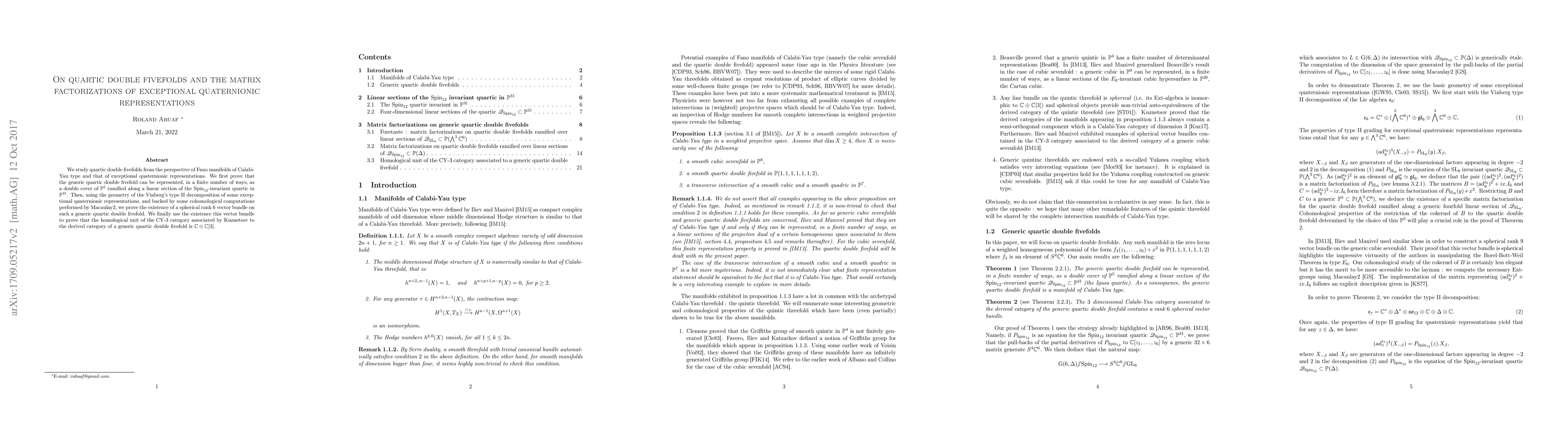 This paper explores quartic double fivefolds through the lens of Fano manifolds and exceptional quaternionic representations, proving their representation as double covers of P^5 and the existence of a spherical rank 6 vector bundle, which leads to the identification of the homological unit of the CY-3 category as C $\oplus$ C[3].