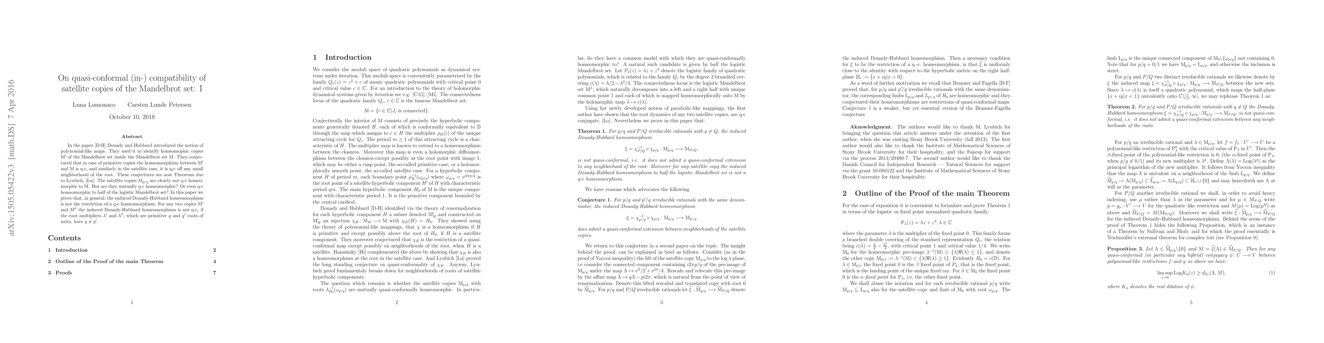 In the paper 'On the dynamics of polynomial-like mappings' Douady and Hubbard introduced the notion of polynomial-like maps. They used it to identify homeomophic copies of the Mandelbrot set inside the Mandelbrot set. They conjectured that in case of primitive copies the homeomorphism between the homeomorphic copy of the Mandelbrot set and the Mandelbrot set is q.-c., and similarly in the satellite case, it is q.-c. off any small neighborhood of the root. These conjectures are now Theorems due to Lyubich. The satellite copies of the Mandelbrot set are clearly not q-c homeomorphic to the Mandelbrot set. But are they mutually q-c homeomorphic? Or even q-c homeomorphic to half of the logistic Mandelbrot set? In this paper we prove that, in general, the induced Douady-Hubbard homeomorphism is not the restriction of a q-c homeomorphism: For any two satellite copies of the Mandelbrot set, the induced Douady-Hubbard homeomorphism is not q-c, if the root multipliers, which are primitive q and q' roots of unity, have q different from q'.