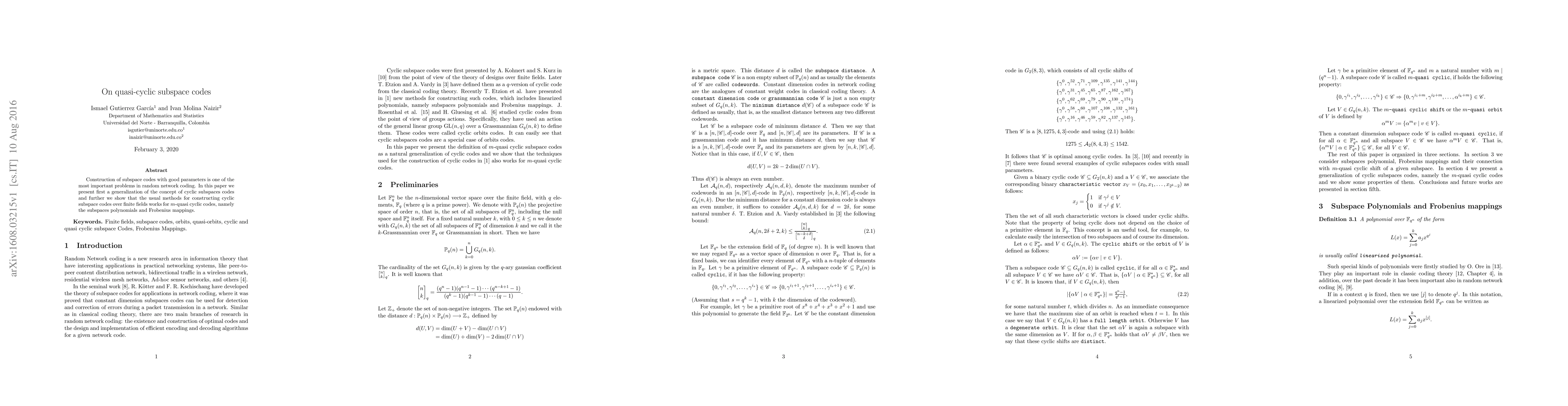 The paper presents a generalization of cyclic subspace codes to m-quasi-cyclic subspace codes, utilizing subspace polynomials and Frobenius mappings.