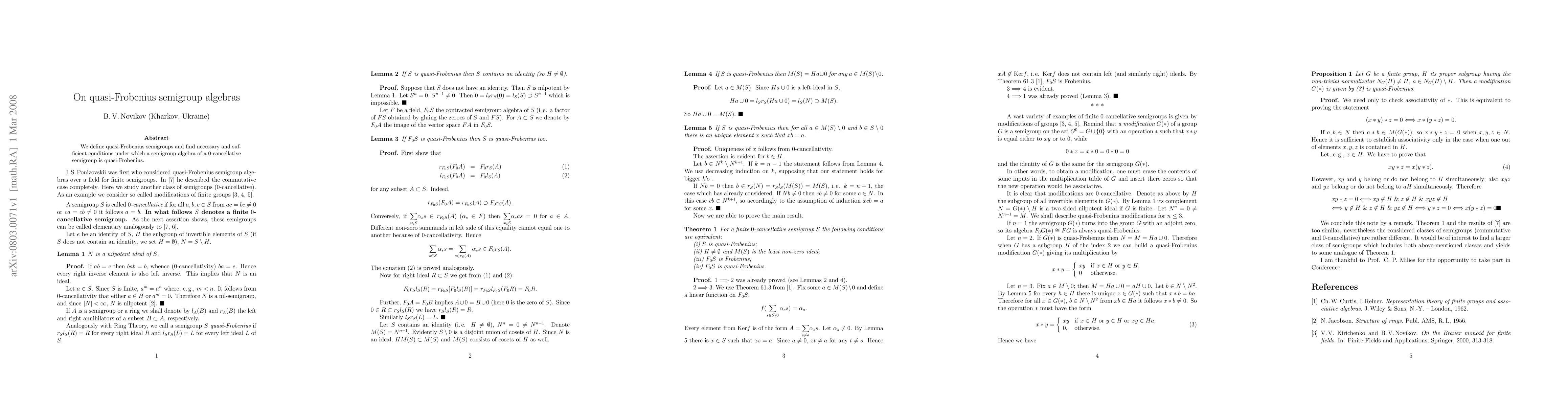 Summary: This paper introduces quasi-Frobenius semigroups and establishes the criteria ensuring that the semigroup algebra of a 0-cancellative semigroup possesses quasi-Frobenius properties. The findings provide a comprehensive understanding of the algebraic structure in question.