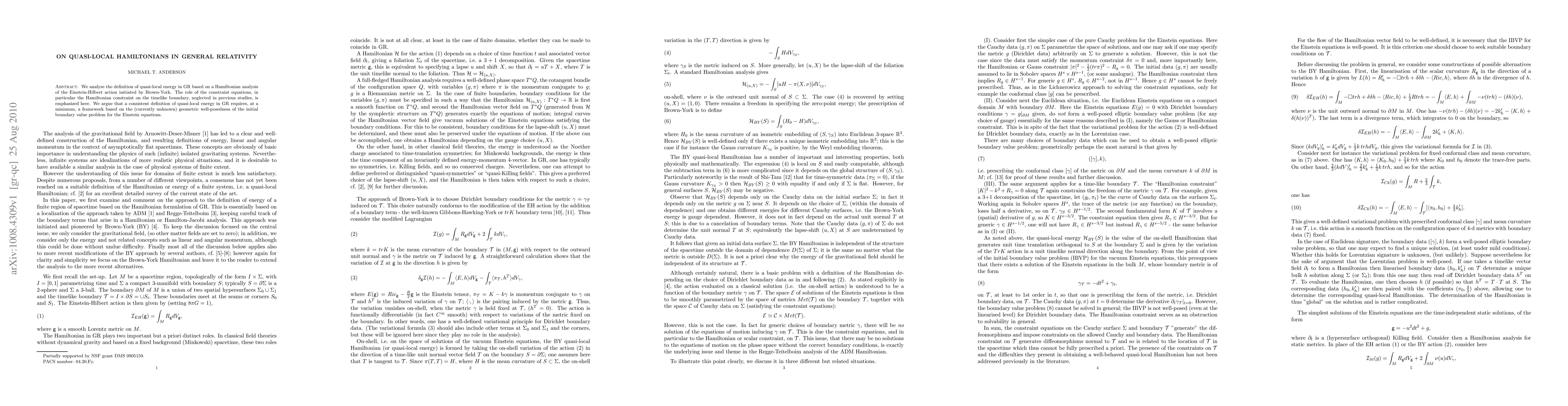 The paper analyzes quasi-local Hamiltonians in General Relativity based on a Hamiltonian analysis of the Einstein-Hilbert action, emphasizing the role of constraint equations, particularly the Hamiltonian constraint on the timelike boundary, which was neglected in previous studies.