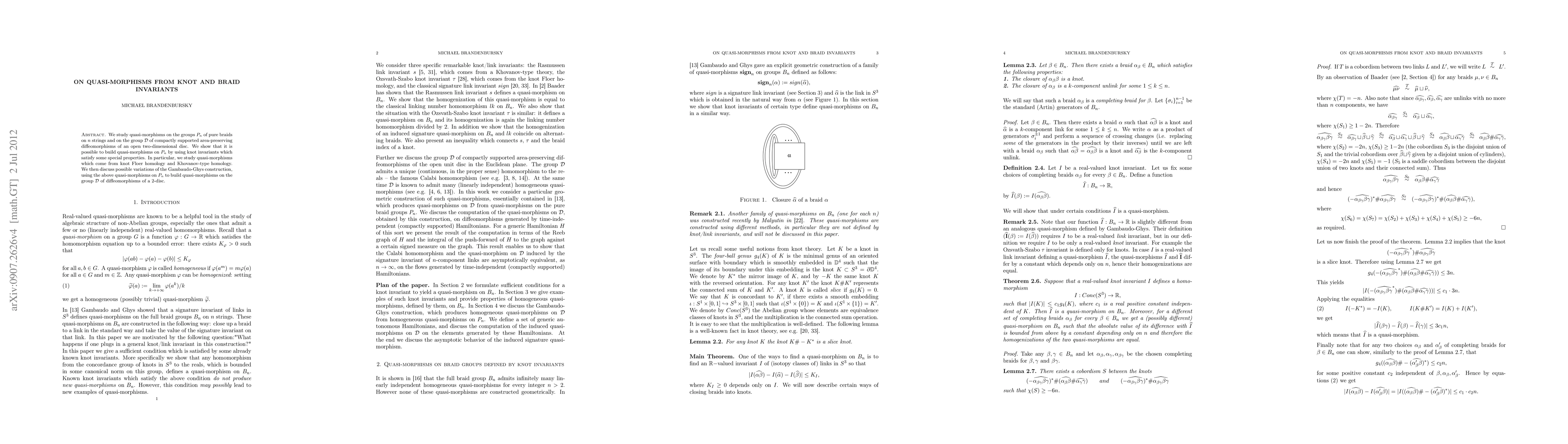 The work presents novel approaches to constructing quasi-morphisms on braid groups and relating them to groups of diffeomorphisms, extending previous results on quasi-morphisms in low-dimensional topology.