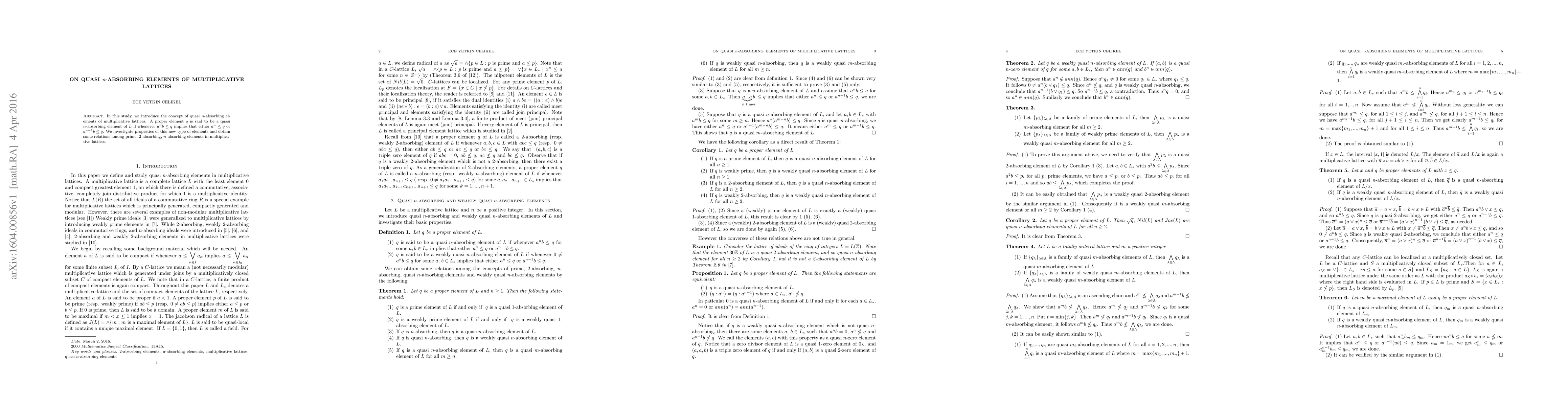 This paper introduces quasi n-absorbing elements in multiplicative lattices, defining them as proper elements that satisfy a specific absorption condition, and explores their properties and relationships with prime and n-absorbing elements.