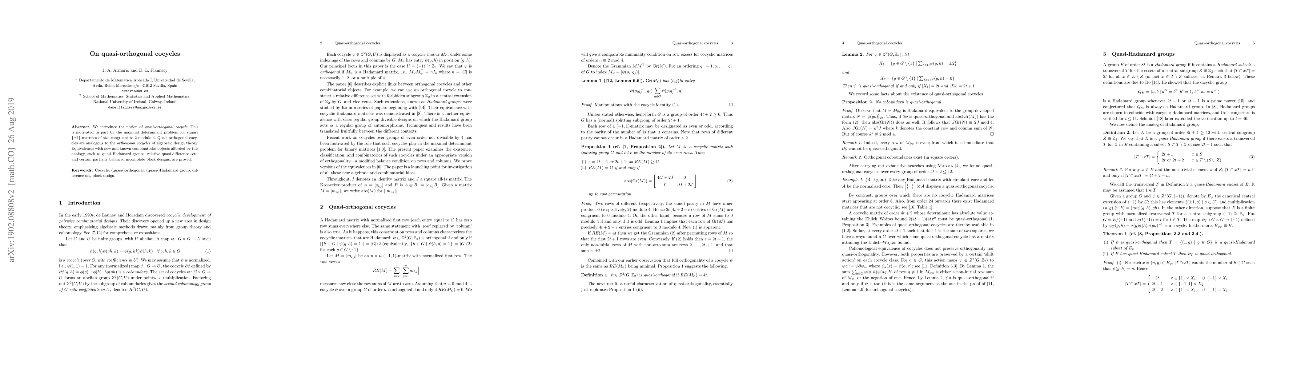 This paper introduces quasi-orthogonal cocycles, motivated by the maximal determinant problem for specific square $\{\pm 1\}$-matrices, and establishes their equivalence to known combinatorial objects like quasi-Hadamard groups and relative quasi-difference sets.