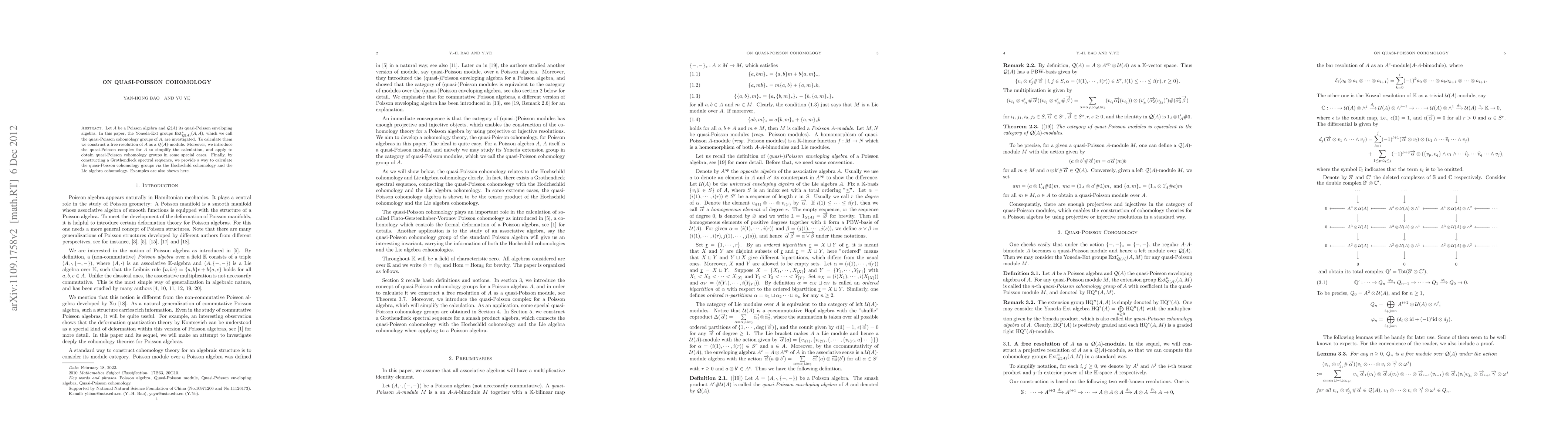 Let $A$ be a Poisson algebra and $\Q(A)$ its quasi-Poisson enveloping algebra. In this paper, the Yoneda-Ext algebra $\Ext^*_{\Q(A)}(A, A)$, which we call the quasi-Poisson cohomology algebra of $A$, is investigated. We construct a projective resolution of $A$ as $\Q(A)$-modules, which enables to compute the quasi-Poisson cohomologies in a standard way. To simplify calculation, we also introduce the quasi-Poisson complex and apply to obtain quasi-Poisson cohomologies in some special cases.
