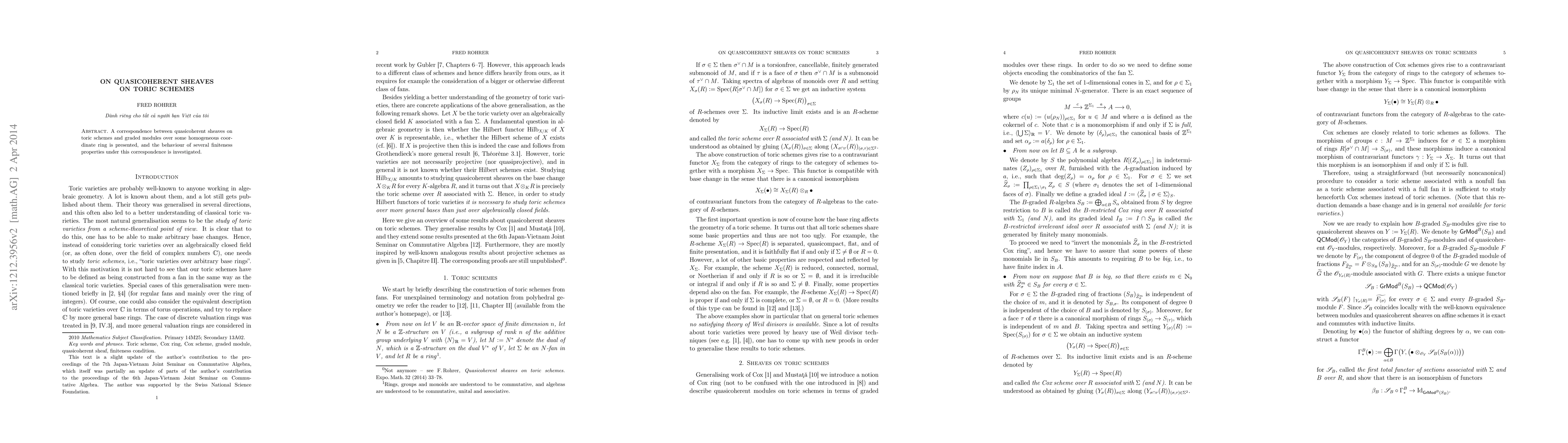 Summary: This paper establishes a link between quasicoherent sheaves on toric schemes and graded modules over their homogeneous coordinate rings, and examines how various finiteness properties are preserved under this correspondence.