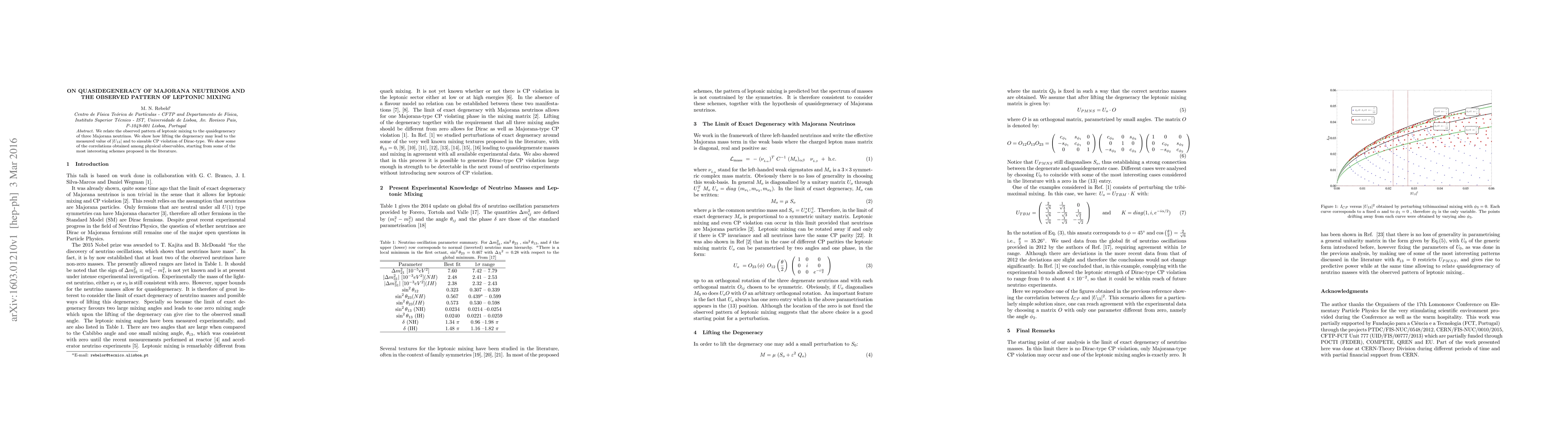 We relate the observed pattern of leptonic mixing to the quaidegeneracy of three Majorana neutrinos. We show how lifting the degeneracy may lead to the measured value of $|U_{13}|$ and to sizeable CP violation of Dirac-type. We show some of the correlations obtained among physical observables, starting from some of the most interesting schemes proposed in the literature.