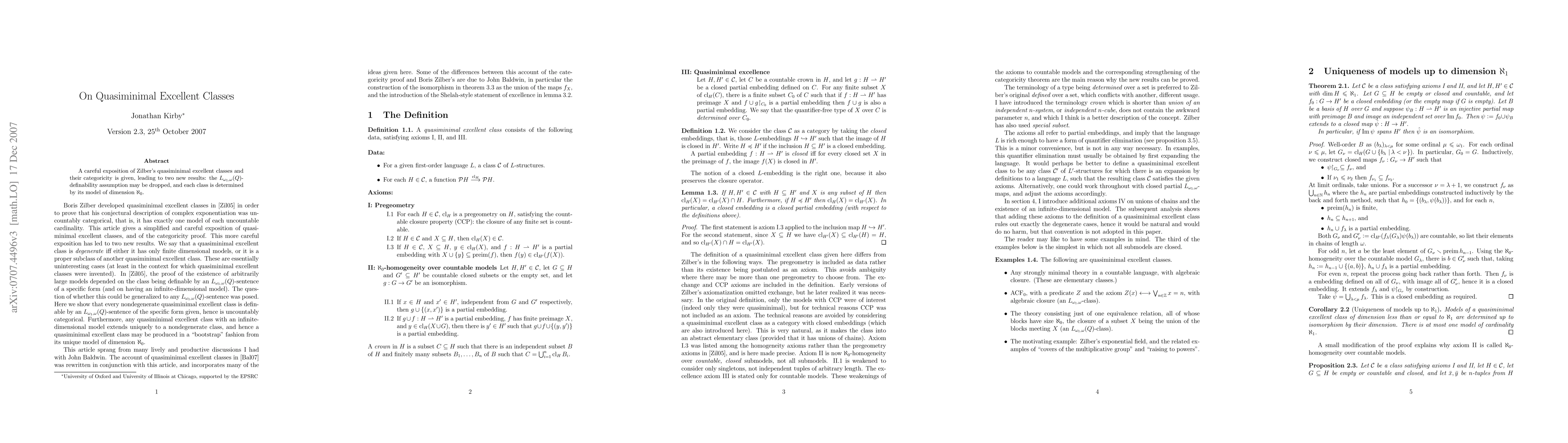 Summary: This paper explores Zilber's quasiminimal excellent classes, demonstrating that their categoricity does not require the L_w1,w(Q)-definability assumption and that each class is uniquely determined by its countable-dimensional model.