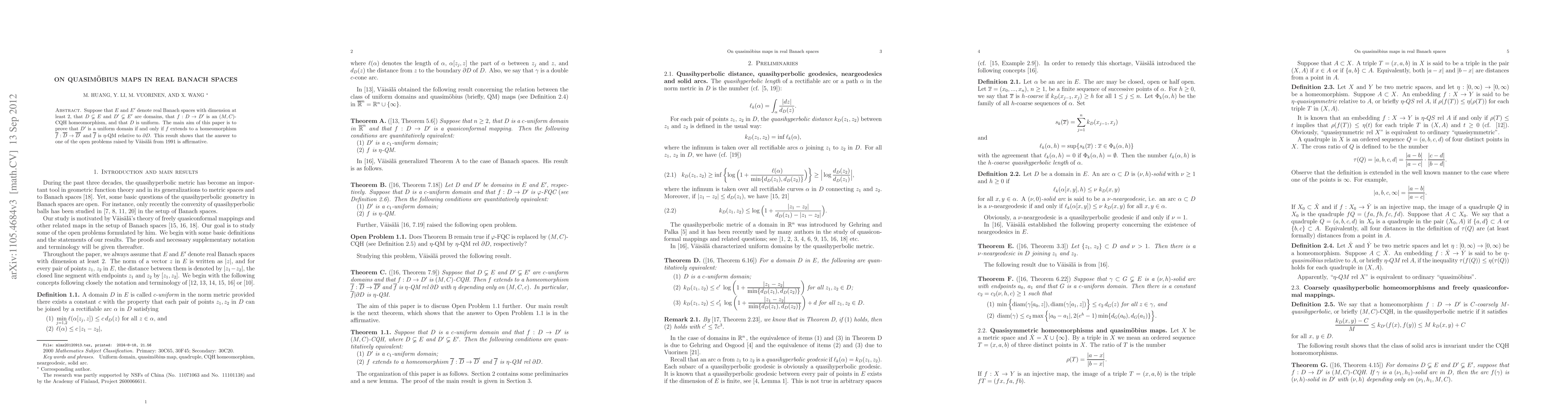 Suppose that $E$ and $E'$ denote real Banach spaces with dimension at least 2, that $D\varsubsetneq E$ and $D'\varsubsetneq E'$ are domains, that $f: D\to D'$ is an $(M,C)$-CQH homeomorphism, and that $D$ is uniform. The main aim of this paper is to prove that $D'$ is a uniform domain if and only if $f$ extends to a homeomorphism $\bar{f}: \bar{D}\to \bar{D}'$ and $\bar{f}$ is $\eta$-QM relative to $\partial D$. This result shows that the answer to one of the open problems raised by V\"ais\"al\"a from 1991 is affirmative.