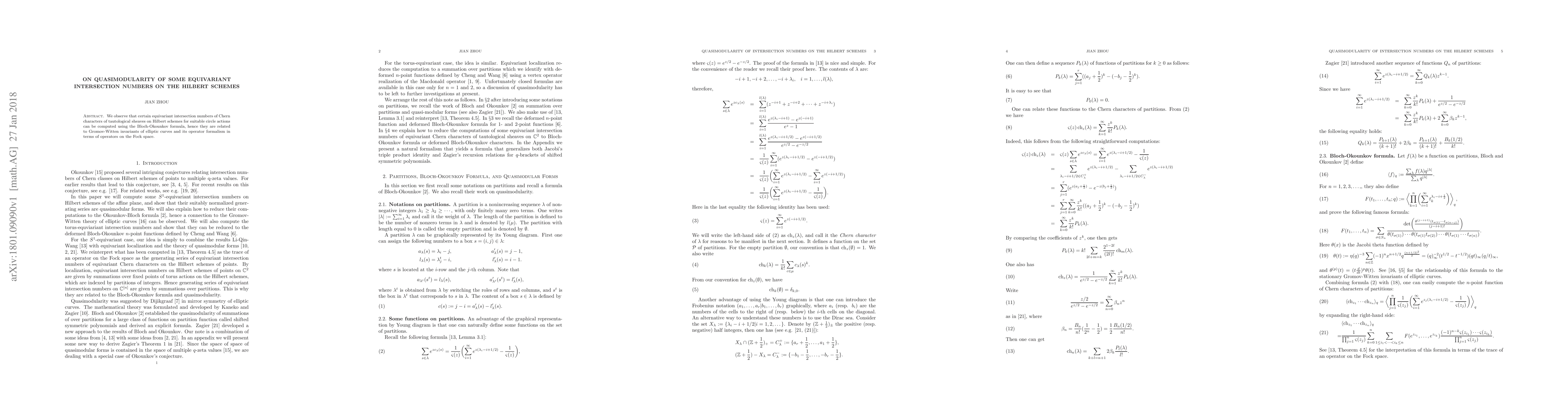 Summary: The paper explores the quasimodularity of specific equivariant intersection numbers on Hilbert schemes, showing they can be calculated via the Bloch-Okounkov formula and are linked to Gromov-Witten invariants of elliptic curves through Fock space operator formalism.