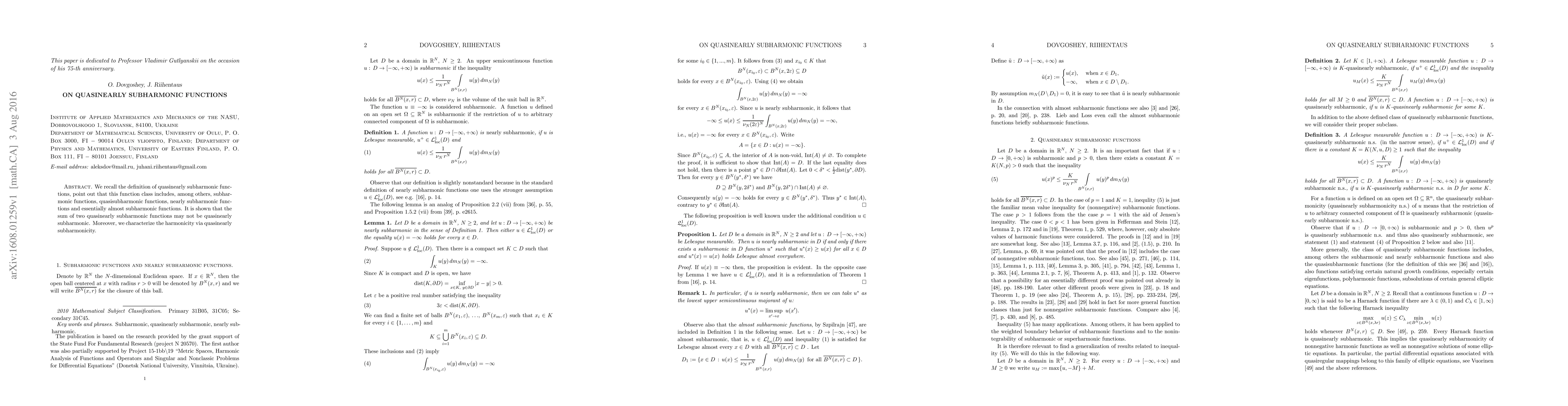 We recall the definition of quasinearly subharmonic functions, point out that this function class includes, among others, subharmonic functions, quasisubharmonic functions, nearly subharmonic functions and essentially almost subharmonic functions. It is shown that the sum of two quasinearly subharmonic functions may not be quasinearly subharmonic. Moreover, we characterize the harmonicity via quasinearly subharmonicity.