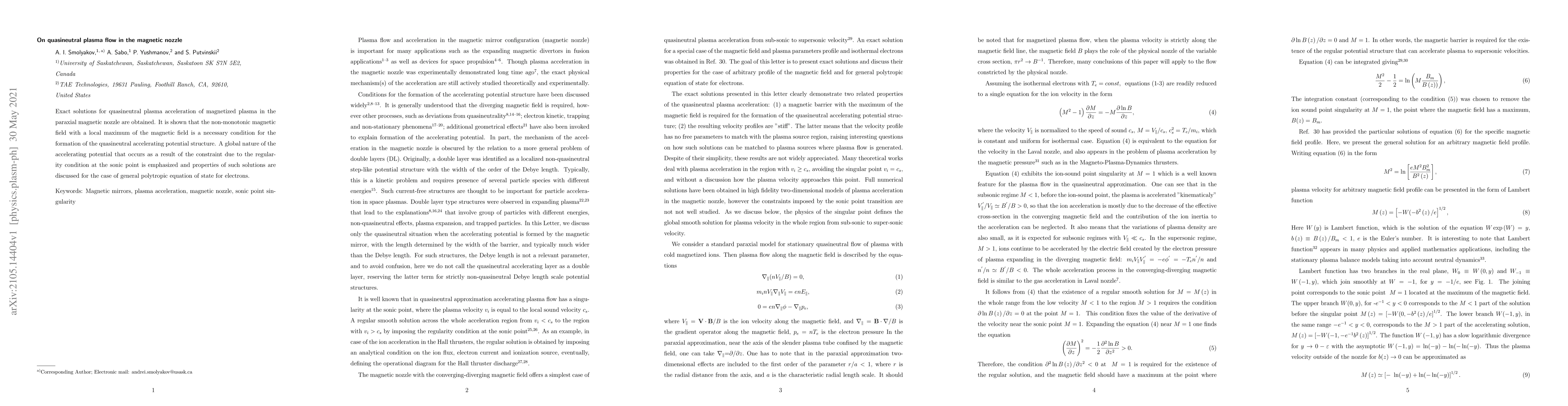 Exact solutions for quasineutral plasma acceleration of magnetized plasma in the paraxial magnetic nozzle are obtained. It is shown that the non-monotonic magnetic field with a local maximum of the magnetic field is a necessary condition for the formation of the quasineutral accelerating potential structure. A global nature of the accelerating potential that occurs as a result of the constraint due to the regularity condition at the sonic point is emphasized and properties of such solutions are discussed for the case of general polytropic equation of state for electrons.
