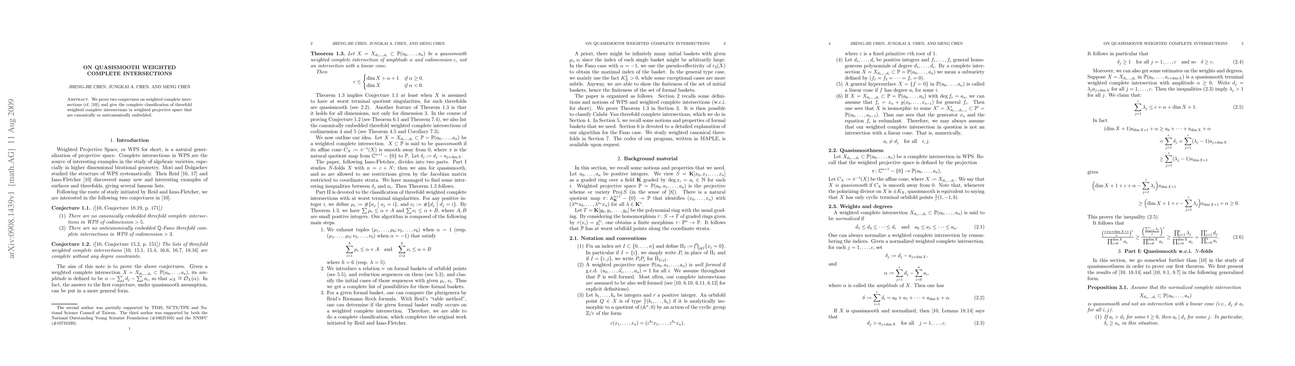 This paper proves two conjectures regarding weighted complete intersections and provides a complete classification of threefolds embedded in weighted projective space that are canonically or anticanonically embedded.