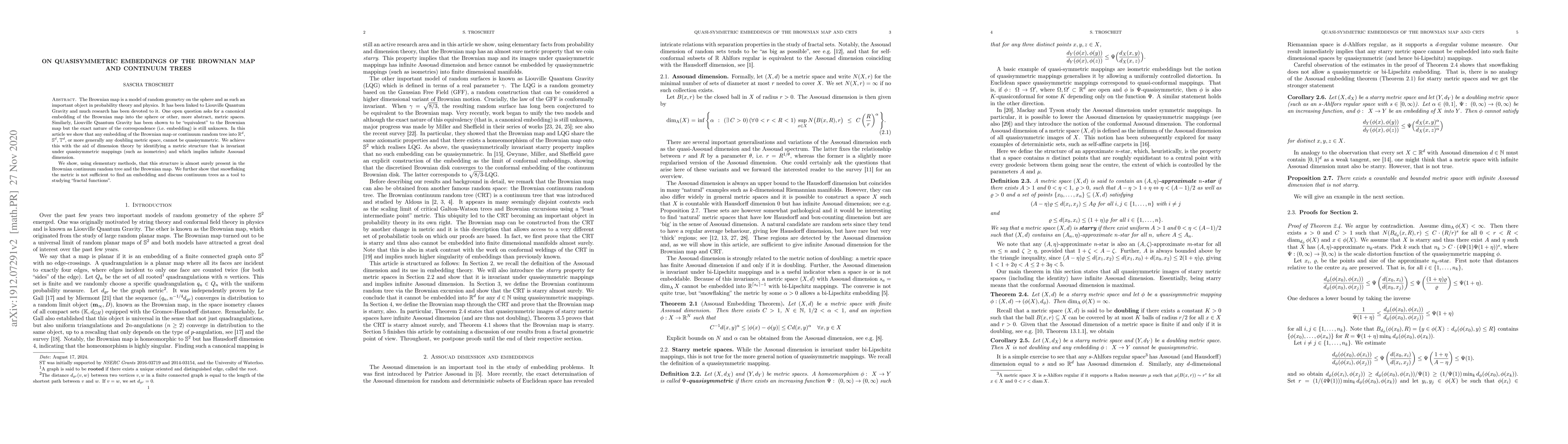 The Brownian map is a model of random geometry on the sphere and as such an important object in probability theory and physics. It has been linked to Liouville Quantum Gravity and much research has been devoted to it. One open question asks for a canonical embedding of the Brownian map into the sphere or other, more abstract, metric spaces. Similarly, Liouville Quantum Gravity has been shown to be "equivalent" to the Brownian map but the exact nature of the correspondence (i.e.\ embedding) is still unknown. In this article we show that any embedding of the Brownian map or continuum random tree into $\mathbb{R}^d$, $\mathbb{S}^d$, $\mathbb{T}^d$, or more generally any doubling metric space, cannot be quasisymmetric. We achieve this with the aid of dimension theory by identifying a metric structure that is invariant under quasisymmetric mappings (such as isometries) and which implies infinite Assouad dimension. We show, using elementary methods, that this structure is almost surely present in the Brownian continuum random tree and the Brownian map. We further show that snowflaking the metric is not sufficient to find an embedding and discuss continuum trees as a tool to studying "fractal functions".
