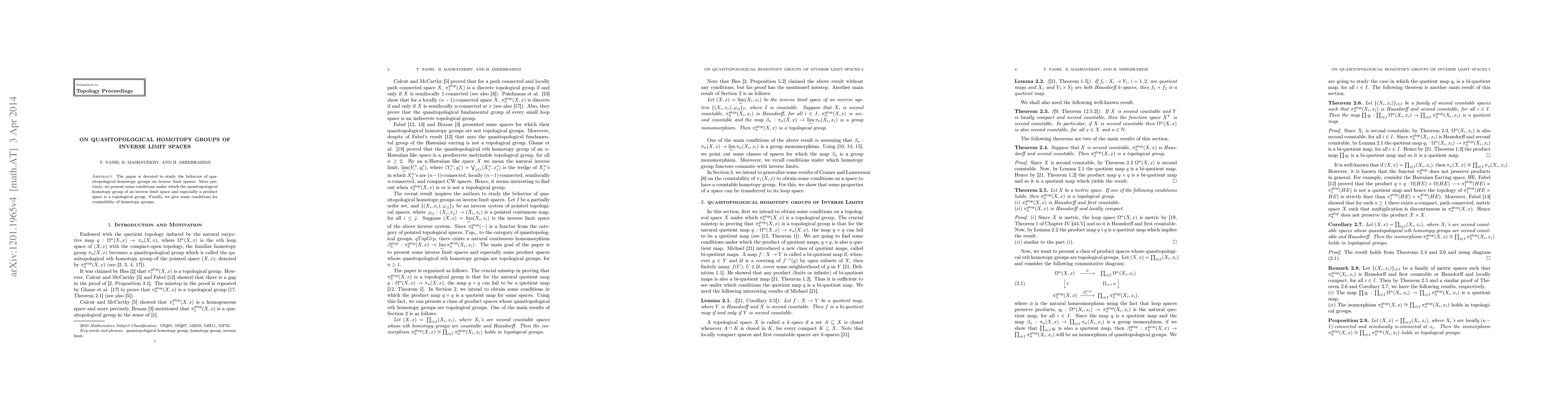 This paper investigates quasitopological homotopy groups within inverse limit spaces, establishing conditions under which these groups form topological groups, particularly for product spaces, and provides criteria for the countability of these homotopy groups.