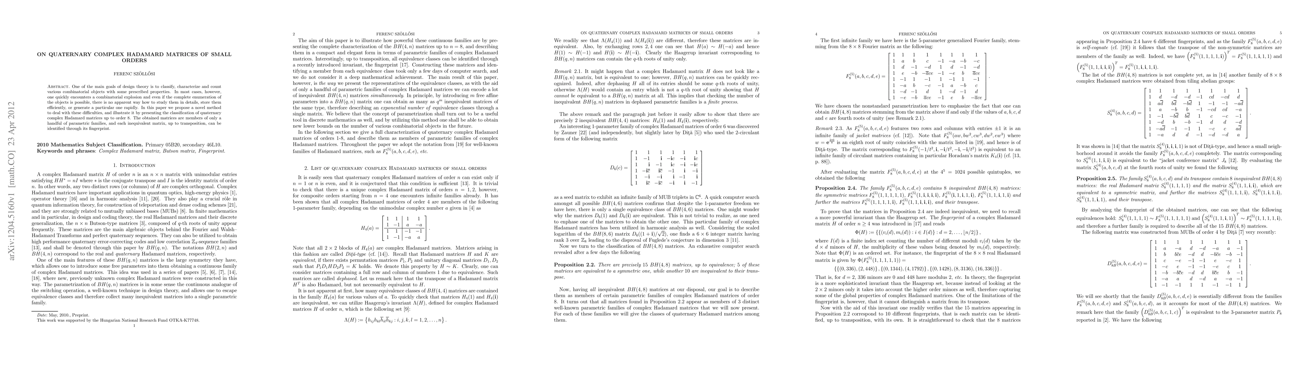 One of the main goals of design theory is to classify, characterize and count various combinatorial objects with some prescribed properties. In most cases, however, one quickly encounters a combinatorial explosion and even if the complete enumeration of the objects is possible, there is no apparent way how to study them in details, store them efficiently, or generate a particular one rapidly. In this paper we propose a novel method to deal with these difficulties, and illustrate it by presenting the classification of quaternary complex Hadamard matrices up to order 8. The obtained matrices are members of only a handful of parametric families, and each inequivalent matrix, up to transposition, can be identified through its fingerprint.