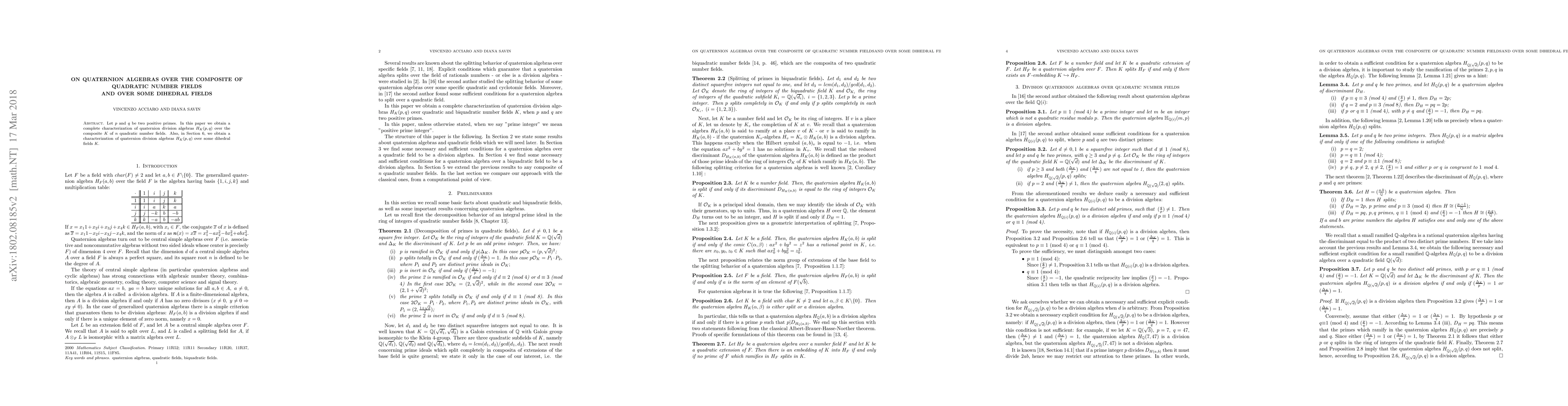 This paper characterizes quaternion division algebras H_K(p,q) over the composite of n quadratic number fields and extends the characterization to some dihedral fields K. The study provides a complete classification of these algebras for specific primes p and q.