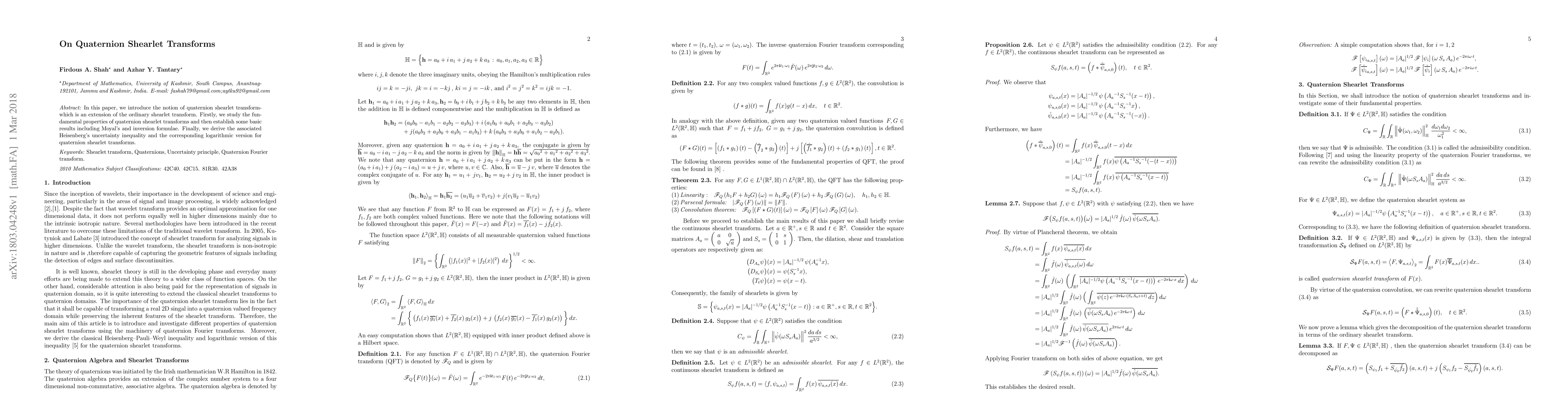 This paper introduces the quaternion shearlet transform, extending the ordinary shearlet transform, and explores its fundamental properties, Moyal's and inversion formulae, Heisenberg's uncertainty inequality, and a logarithmic version for the new transform.