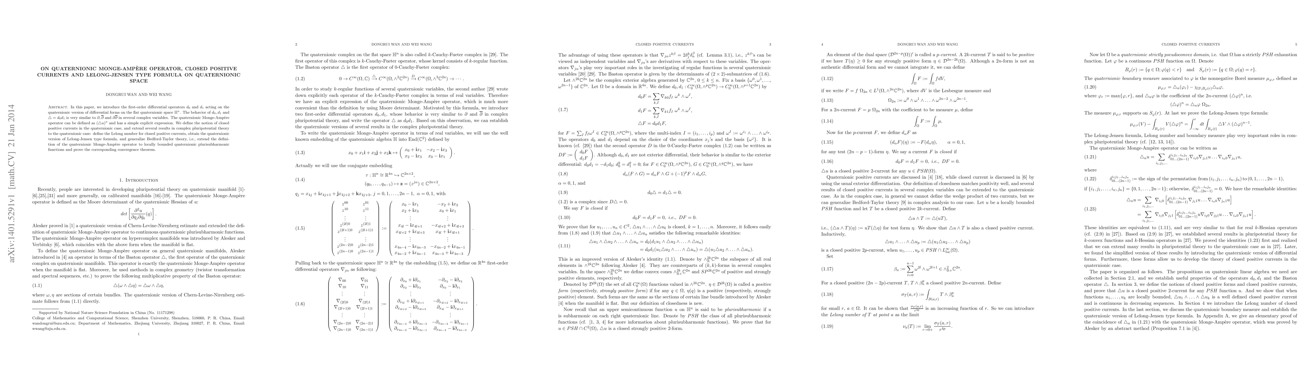 In this paper, we introduce the first-order differential operators $d_0$ and $d_1$ acting on the quaternionic version of differential forms on the flat quaternionic space $\mathbb{H}^n$. The behavior of $d_0,d_1$ and $\triangle=d_0d_1$ is very similar to $\partial,\overline{\partial}$ and $\partial \overline{\partial}$ in several complex variables. The quaternionic Monge-Amp\`{e}re operator can be defined as $(\triangle u)^n$ and has a simple explicit expression. We define the notion of closed positive currents in the quaternionic case, and extend several results in complex pluripotential theory to the quaternionic case: define the Lelong number for closed positive currents, obtain the quaternionic version of Lelong-Jensen type formula, and generalize Bedford-Taylor theory, i.e., extend the definition of the quaternionic Monge-Amp\`{e}re operator to locally bounded quaternionic plurisubharmonic functions and prove the corresponding convergence theorem.