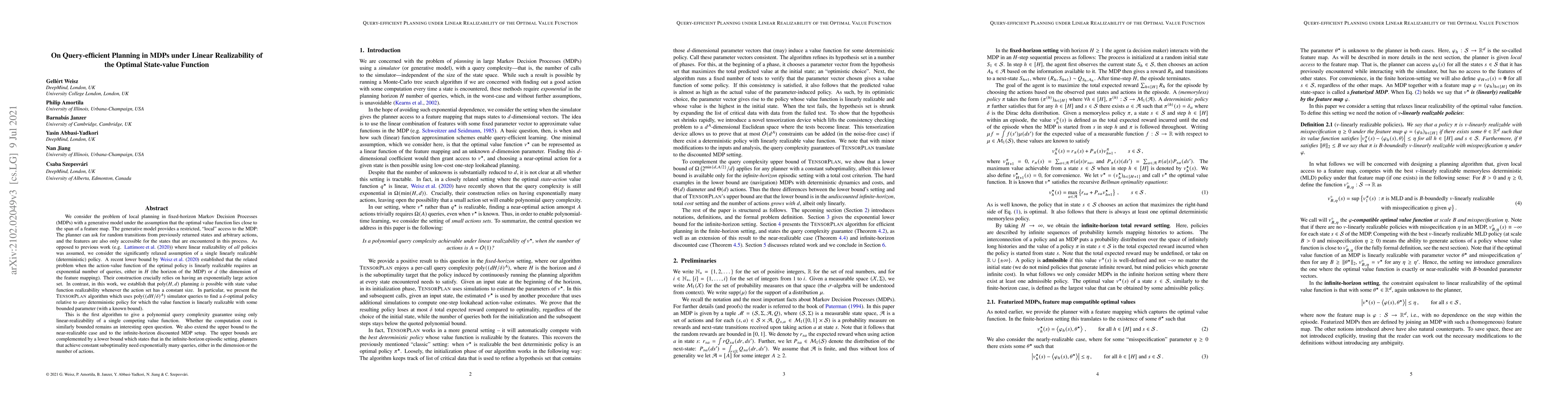 This paper explores query-efficient planning in fixed-horizon MDPs under the assumption that the optimal state-value function is linearly realizable. It introduces the TensorPlan algorithm, which achieves polynomial query complexity when the action set is of constant size, contrasting with previous work that requires linear realizability for all policies. The study also extends results to near-realizable cases and infinite-horizon settings, while highlighting computational challenges.
