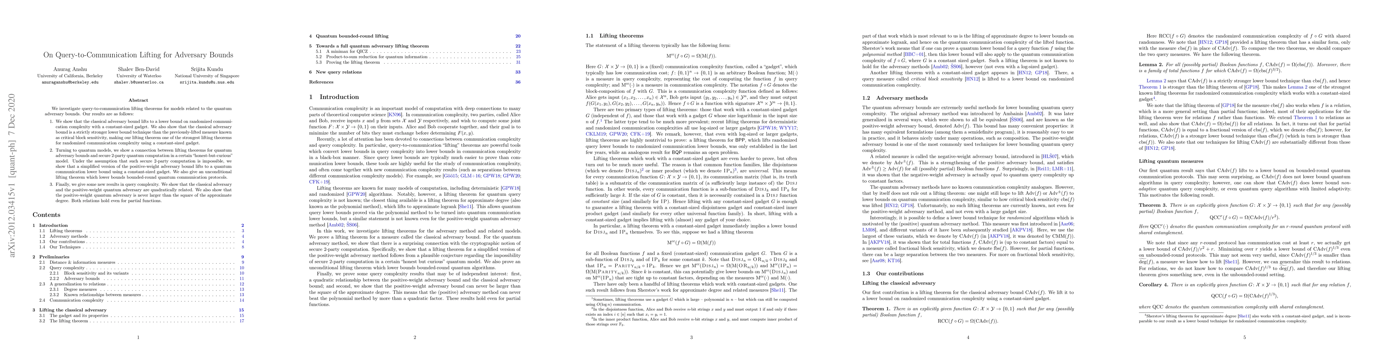 We investigate query-to-communication lifting theorems for models related to the quantum adversary bounds. Our results are as follows: 1. We show that the classical adversary bound lifts to a lower bound on randomized communication complexity with a constant-sized gadget. We also show that the classical adversary bound is a strictly stronger lower bound technique than the previously-lifted measure known as critical block sensitivity, making our lifting theorem one of the strongest lifting theorems for randomized communication complexity using a constant-sized gadget. 2. Turning to quantum models, we show a connection between lifting theorems for quantum adversary bounds and secure 2-party quantum computation in a certain "honest-but-curious" model. Under the assumption that such secure 2-party computation is impossible, we show that a simplified version of the positive-weight adversary bound lifts to a quantum communication lower bound using a constant-sized gadget. We also give an unconditional lifting theorem which lower bounds bounded-round quantum communication protocols. 3. Finally, we give some new results in query complexity. We show that the classical adversary and the positive-weight quantum adversary are quadratically related. We also show that the positive-weight quantum adversary is never larger than the square of the approximate degree. Both relations hold even for partial functions.