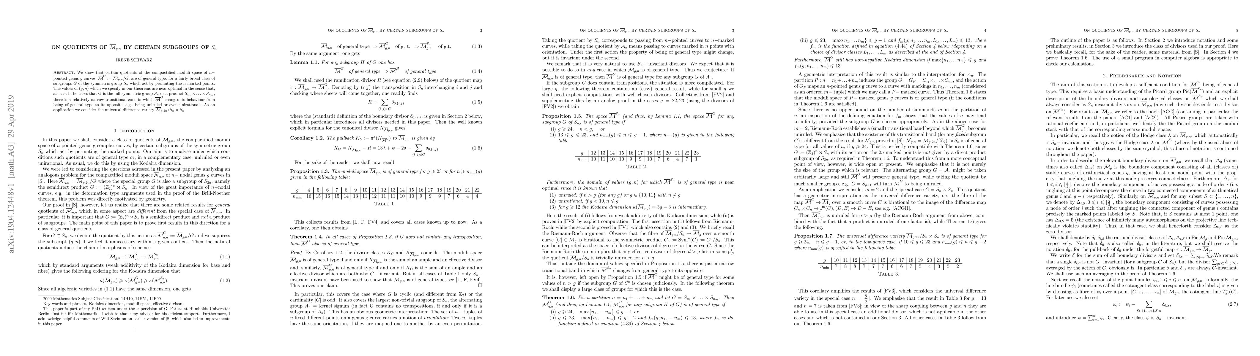We show that certain quotients of the compactified moduli space of $n-$ pointed genus $g$ curves, $\overline{\mathcal{M}}^G:= \overline{\mathcal{M}}_{g,n} / G$, are of general type, for a fairly broad class of subgroups $G$ of the symmetric group $S_n$ which act by permuting the $n$ marked points. The values of $(g,n)$ which we specify in our theorems are near optimal in the sense that, at least in he cases that G is the full symmetric group $S_n$ or a product $S_{n_1}\times \ldots \times S_{n_m}$, there is a relatively narrow transitional zone in which $\overline{\mathcal{M}}^G$ changes its behaviour from being of general type to its opposite, e.g. being uniruled or even unirational. As an application we consider the universal difference variety $\overline{\mathcal{M}}_{g,2n} /S_n \times S_n$.