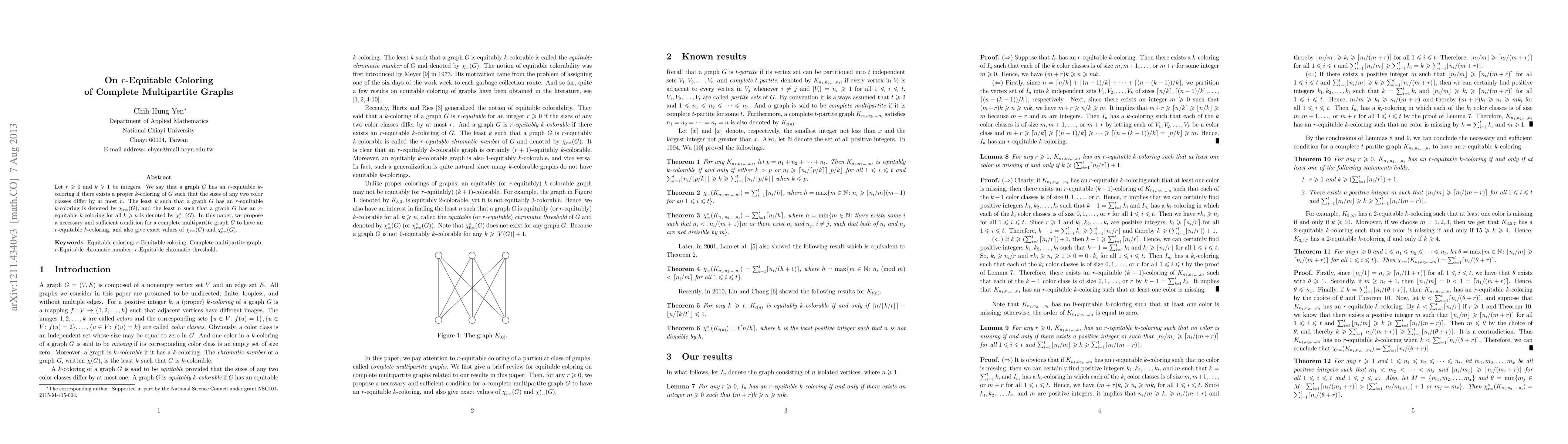 This paper investigates $r$-equitable coloring of complete multipartite graphs, providing a necessary and sufficient condition for such colorings, and determining exact values for $\chi_{r=} (G)$ and $\chi^*_{r=} (G)$.