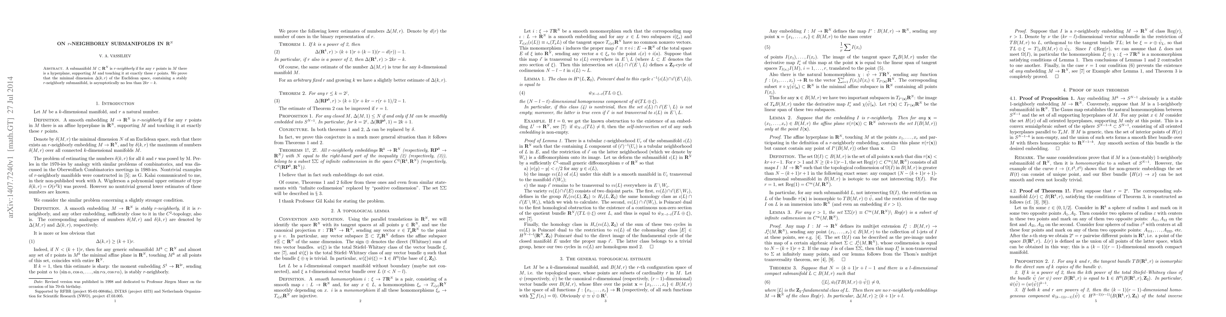 Summary: This paper explores $r$-neighborly submanifolds in $R^N$, proving that the minimum dimension needed to contain a stably $r$-neighborly submanifold is asymptotically at least $2kr-k$.