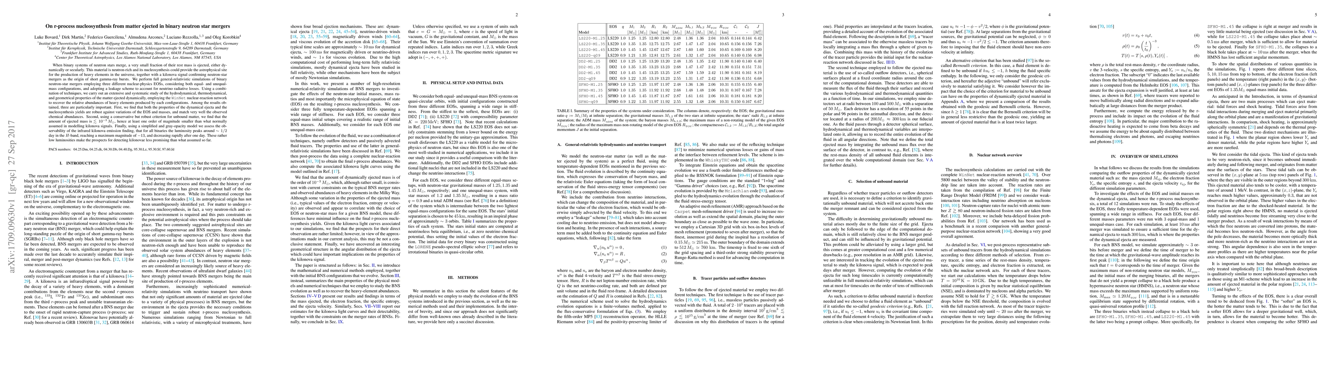 This paper investigates the r-process nucleosynthesis from neutron-star mergers, finding that ejected mass is much smaller than previously assumed, and that the infrared kilonovae luminosity peaks around 1/2 day, making detection less promising. The study confirms that nucleosynthesis yields match observed chemical abundances, regardless of the nuclear-physics EOS used.