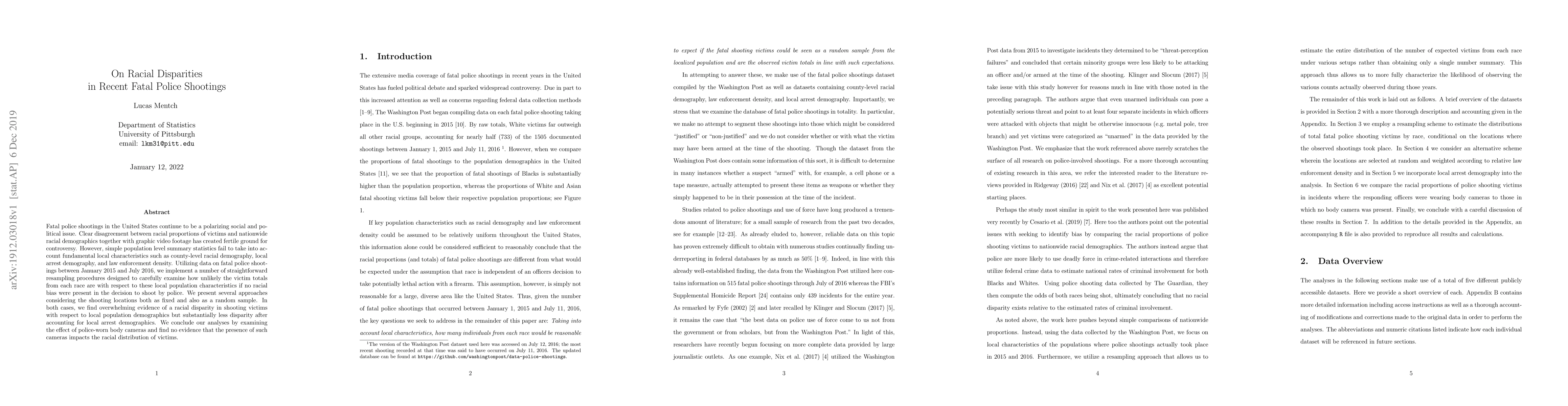 This study examines racial disparities in fatal police shootings in the U.S. from 2015 to 2016, finding significant racial bias when considering local population demographics but less so when factoring in local arrest demographics. The research also finds no impact of police body cameras on the racial distribution of shooting victims.