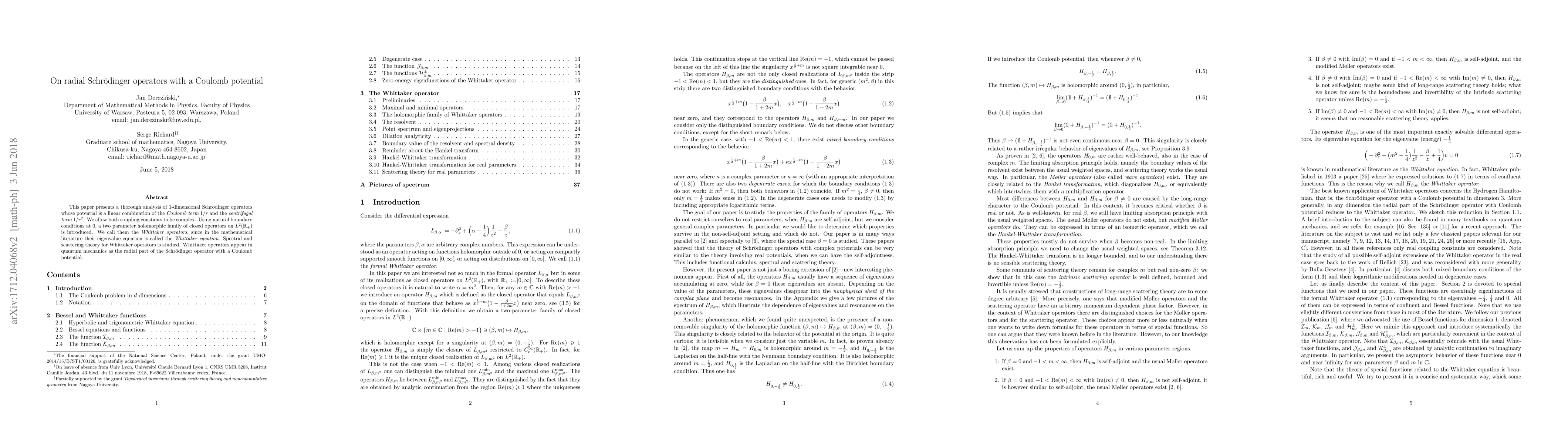 This paper presents a thorough analysis of 1-dimensional Schroedinger operators whose potential is a linear combination of the Coulomb term 1/r and the centrifugal term 1/r^2. We allow both coupling constants to be complex. Using natural boundary conditions at 0, a two parameter holomorphic family of closed operators is introduced. We call them the Whittaker operators, since in the mathematical literature their eigenvalue equation is called the Whittaker equation. Spectral and scattering theory for Whittaker operators is studied. Whittaker operators appear in quantum mechanics as the radial part of the Schroedinger operator with a Coulomb potential.