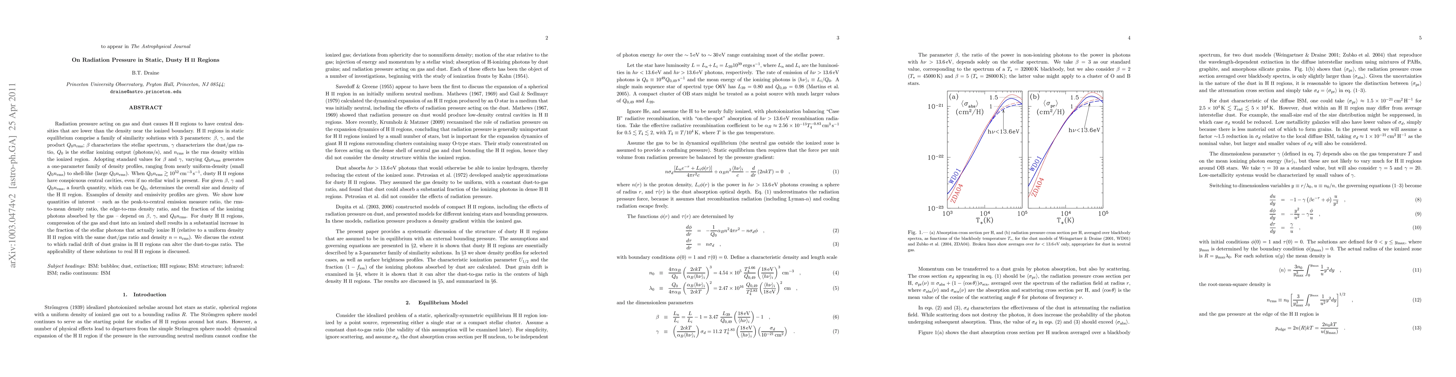 This paper explores the impact of radiation pressure on gas and dust in static HII regions, detailing how ionizing radiation influences density profiles and central cavities. It identifies key parameters that determine the size, density, and emissivity of HII regions, and discusses the implications for the fraction of ionizing photons absorbed by the gas.