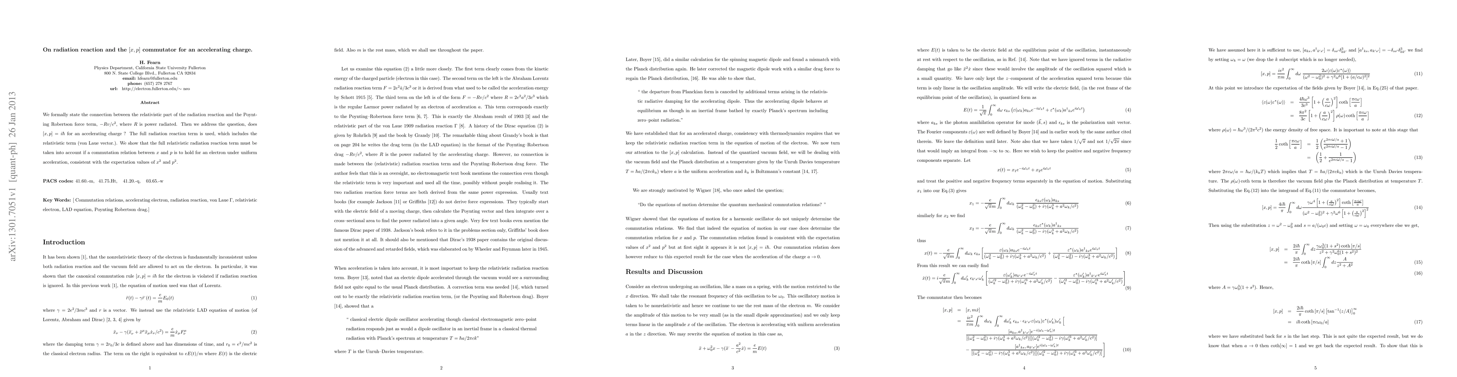 We formally state the connection between the relativistic part of the radiation reaction and the Poynting Robertson force term, $-Rv/c^2$, where $R$ is power radiated. Then we address the question, does $[x,p]=i \hb$ for an accelerating charge ? The full radiation reaction term is used, which includes the relativistic term (von Laue vector.). We show that the full relativistic radiation reaction term must be taken into account if a commutation relation between $x$ and $p$ is to hold for an electron under uniform acceleration, consistent with the expectation values of $x^2$ and $p^2$.