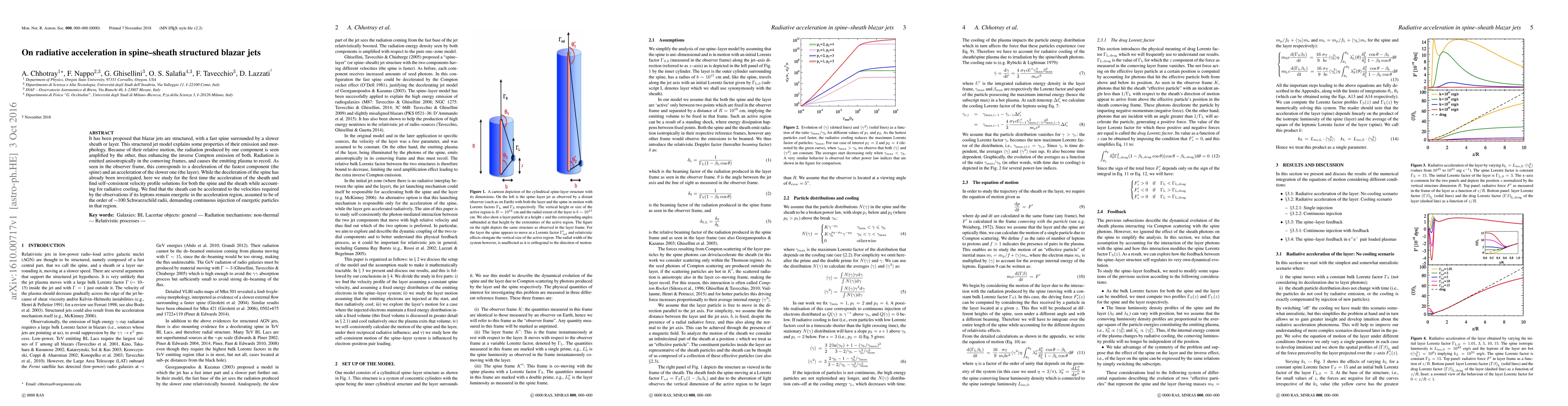 This paper investigates the radiative acceleration in blazar jets structured as a fast spine and a slower sheath, finding that the sheath can be accelerated to observed velocities if energetic particles are continuously injected within the first 100 Schwarzschild radii. It presents self-consistent velocity profiles for both components, accounting for radiative cooling.
