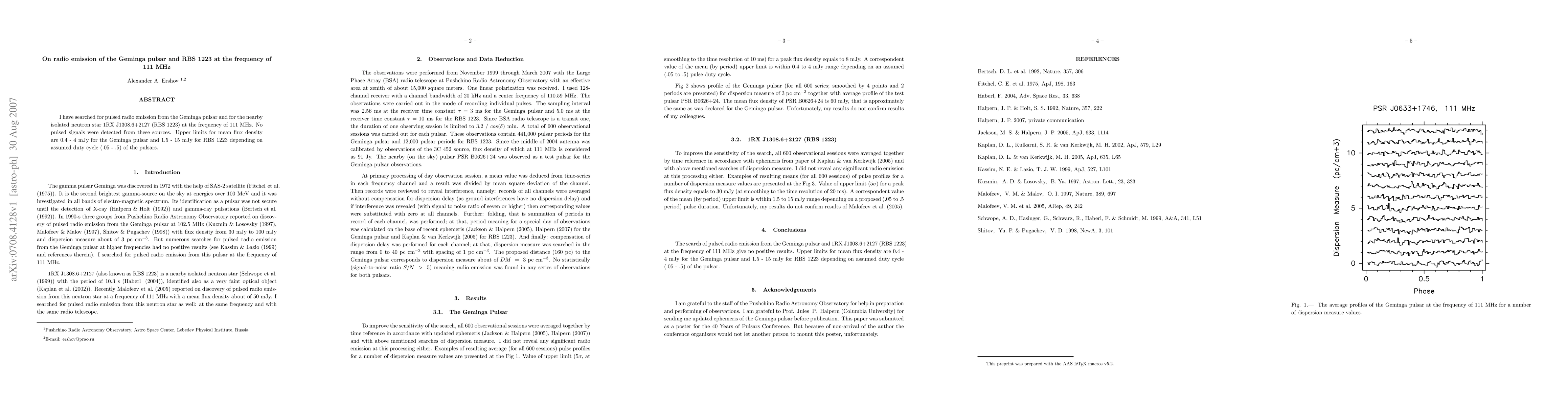 I have searched for pulsed radio emission from the Geminga pulsar and for the nearby isolated neutron star 1RX J1308.6+2127 (RBS 1223) at the frequency of 111 MHz. No pulsed signals were detected from these sources. Upper limits for mean flux density are 0.4 - 4 mJy for the Geminga pulsar and 1.5 - 15 mJy for RBS 1223 depending on assumed duty cycle (.05 - .5) of the pulsars.