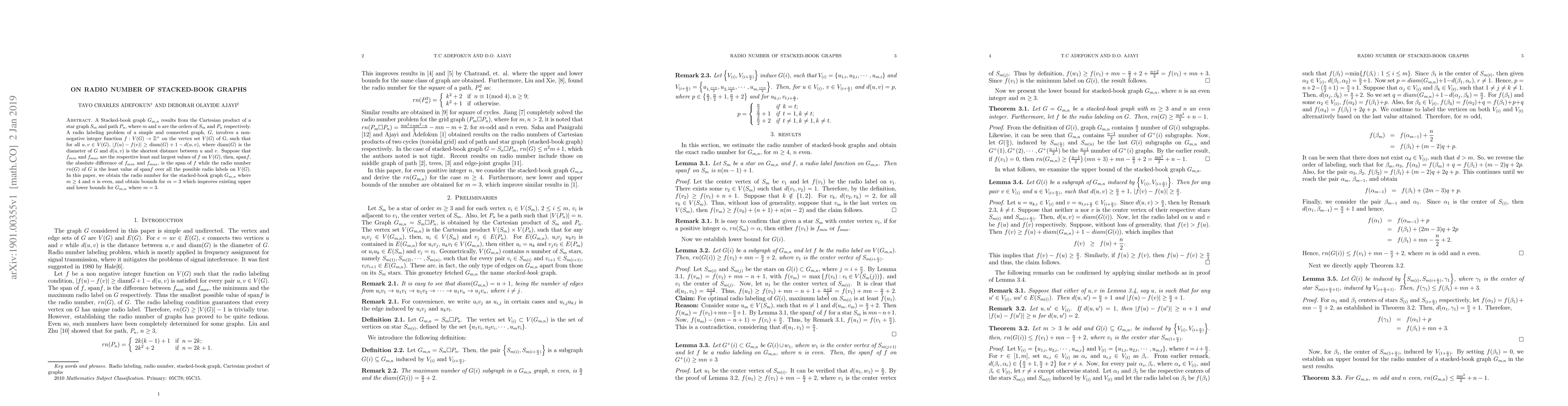 A Stacked-book graph $G_{m,n}$ results from the Cartesian product of a star graph $S_m$ and path $P_n$, where $m$ and $n$ are the orders of $S_m$ and $P_n$ respectively. A radio labeling problem of a simple and connected graph, $G$, involves a non-negative integer function $f:V(G)\rightarrow \mathbb Z^+$ on the vertex set $V(G)$ of G, such that for all $u,v \in V(G)$, $|f(u)-f(v)| \geq \textmd{diam}(G)+1-d(u,v)$, where $\textmd {diam}(G)$ is the diameter of $G$ and $d(u,v)$ is the shortest distance between $u$ and $v$. Suppose that $f_{min}$ and $f_{max}$ are the respective least and largest values of $f$ on $V(G)$, then, span$f$, the absolute difference of $f_{min}$ and $f_{max}$, is the span of $f$ while the radio number $rn(G)$ of $G$ is the least value of span$f$ over all the possible radio labels on $V(G)$. In this paper, we obtain the radio number for the stacked-book graph $G_{m,n}$ where $m \geq 4$ and $n$ is even, and obtain bounds for $m=3$ which improves existing upper and lower bounds for $G_{m,n}$ where $m=3$.