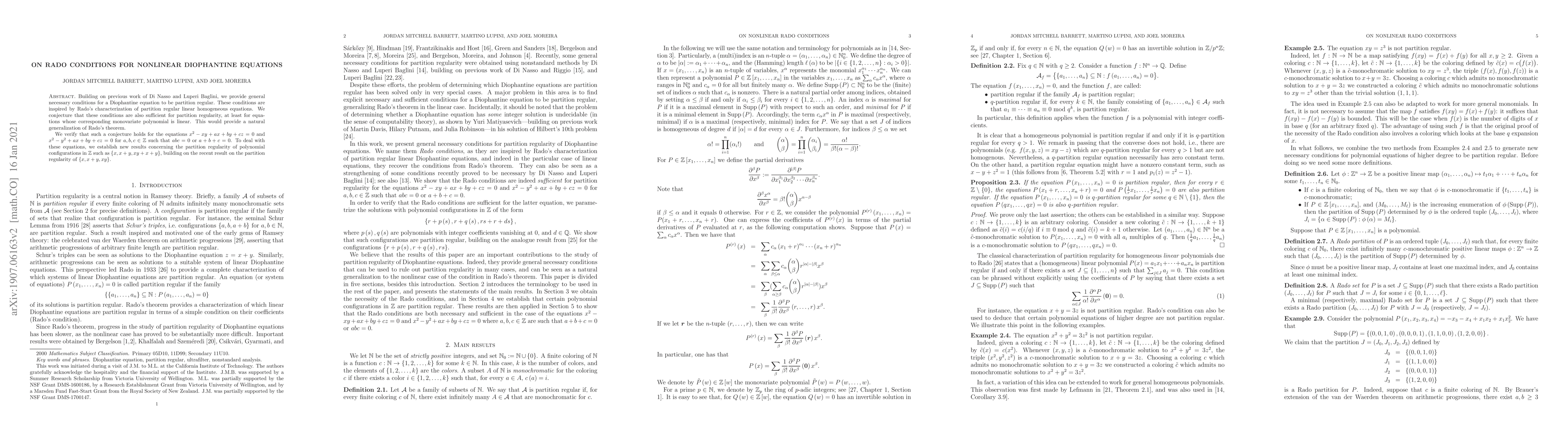 Building on previous work of Di Nasso and Luperi Baglini, we provide general necessary conditions for a Diophantine equation to be partition regular. These conditions are inspired by Rado's characterization of partition regular linear homogeneous equations. We conjecture that these conditions are also sufficient for partition regularity, at least for equations whose corresponding monovariate polynomial is linear. This would provide a natural generalization of Rado's theorem. We verify that such a conjecture hold for the equations $x^{2}-xy+ax+by+cz=0$ and $x^{2}-y^{2}+ax+by+cz=0$ for $a,b,c\in \mathbb{Z}$ such that $abc=0$ or $% a+b+c=0$. To deal with these equations, we establish new results concerning the partition regularity of polynomial configurations in $\mathbb{Z}$ such as $\left\{ x,x+y,xy+x+y\right\} $, building on the recent result on the partition regularity of $\left\{ x,x+y,xy\right\} $.