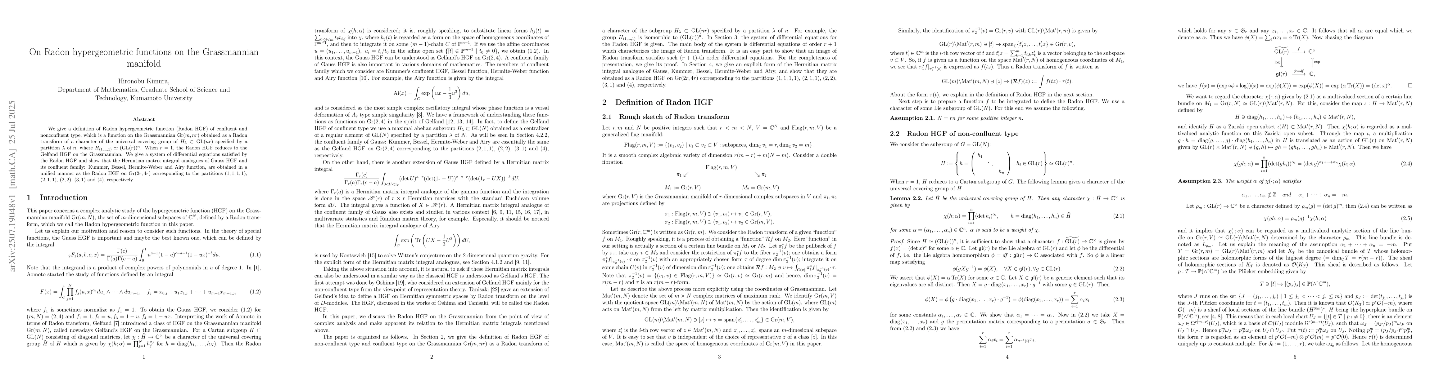 We give a definition of Radon hypergeometric function (Radon HGF) of confluent and nonconfluent type, which is a function on the Grassmannian Gr(m,nr) obtained as a Radon transform of a character of the universal covering group of H_{\lambda}\subset GL(nr) specified by a partition \lambda of n, where H_{(1,\dots,1)}\simeq(GL(r))^{n}. When r=1, the Radon HGF reduces to the Gelfand HGF on the Grassmannian. We give a system of differential equations satisfied by the Radon HGF and show that the Hermitian matrix integral analogues of Gauss HGF and its confluent family: Kummer, Bessel, Hermite-Weber and Airy function, are obtained in a unified manner as the Radon HGF on Gr(2r,4r) corresponding to the partitions (1,1,1,1), (2,1,1), (2,2), (3,1) and (4), respectively.