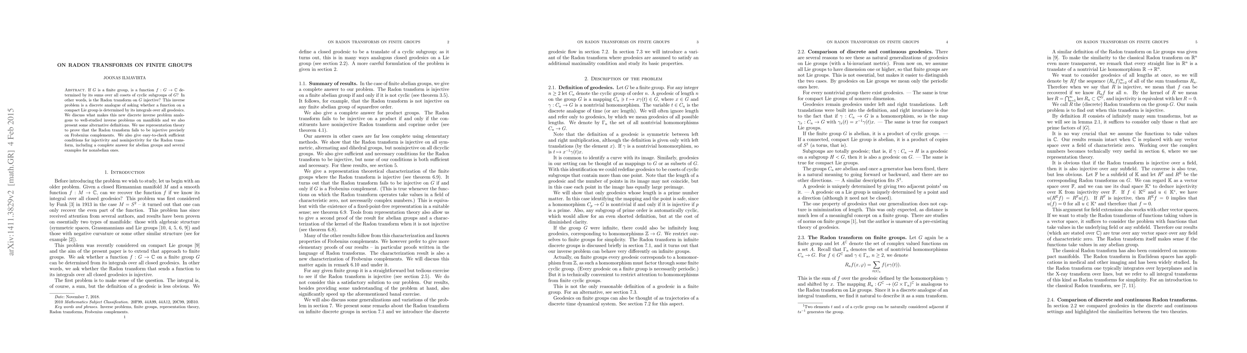 If $G$ is a finite group, is a function $f:G\to\mathbb C$ determined by its sums over all cosets of cyclic subgroups of $G$? In other words, is the Radon transform on $G$ injective? This inverse problem is a discrete analogue of asking whether a function on a compact Lie group is determined by its integrals over all geodesics. We discuss what makes this new discrete inverse problem analogous to well-studied inverse problems on manifolds and we also present some alternative definitions. We use representation theory to prove that the Radon transform fails to be injective precisely on Frobenius complements. We also give easy-to-check sufficient conditions for injectivity and noninjectivity for the Radon transform, including a complete answer for abelian groups and several examples for nonabelian ones.