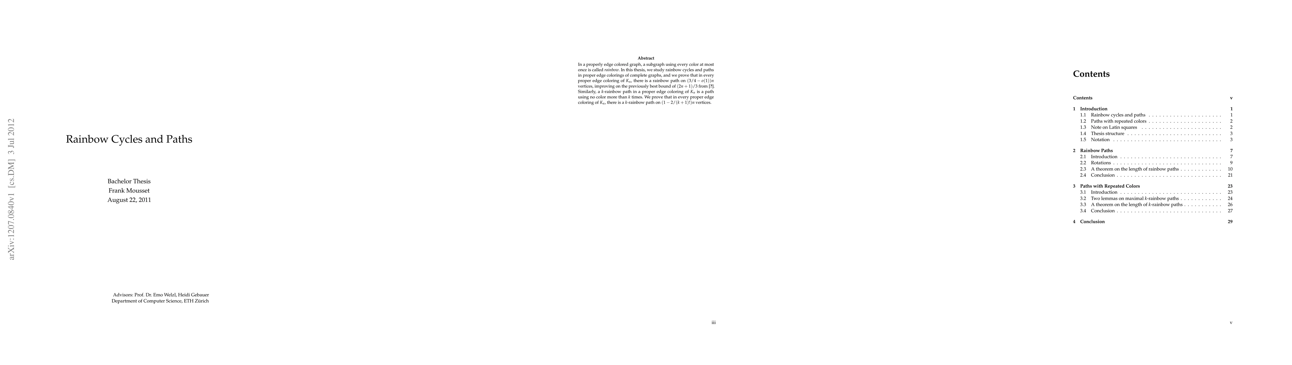 In a properly edge colored graph, a subgraph using every color at most once is called rainbow. In this thesis, we study rainbow cycles and paths in proper edge colorings of complete graphs, and we prove that in every proper edge coloring of K_n, there is a rainbow path on (3/4-o(1))n vertices, improving on the previously best bound of (2n+1)/3 from Gyarfas and Mhalla. Similarly, a k-rainbow path in a proper edge coloring of K_n is a path using no color more than k times. We prove that in every proper edge coloring of K_n, there is a k-rainbow path on (1-2/(k+1)!)n vertices.