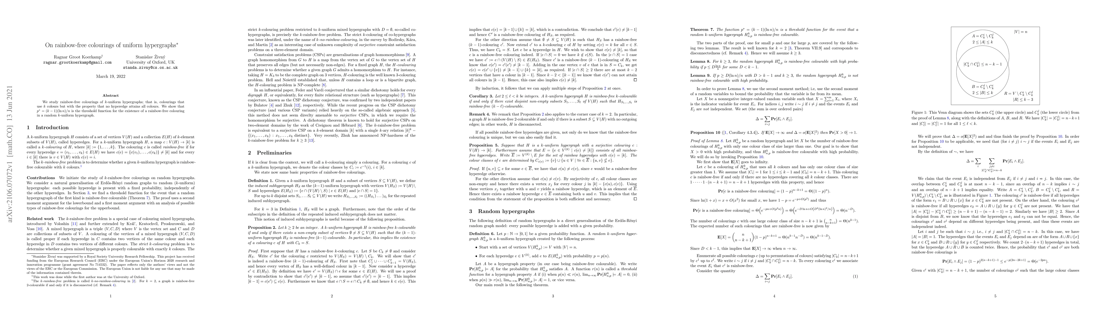 This paper investigates rainbow-free colourings in $k$-uniform hypergraphs, where no hyperedge uses all $k$ colours. It establishes that $p^*=(k-1)(\ln n)/n$ is the critical probability for the existence of such colourings in a random $k$-uniform hypergraph.